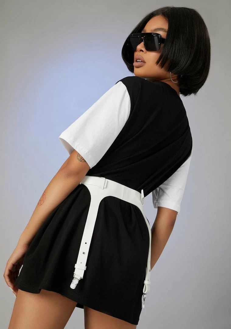 cuz youâre always in control. This garter belt bag has o-ring detailing, chains and buckle closure.