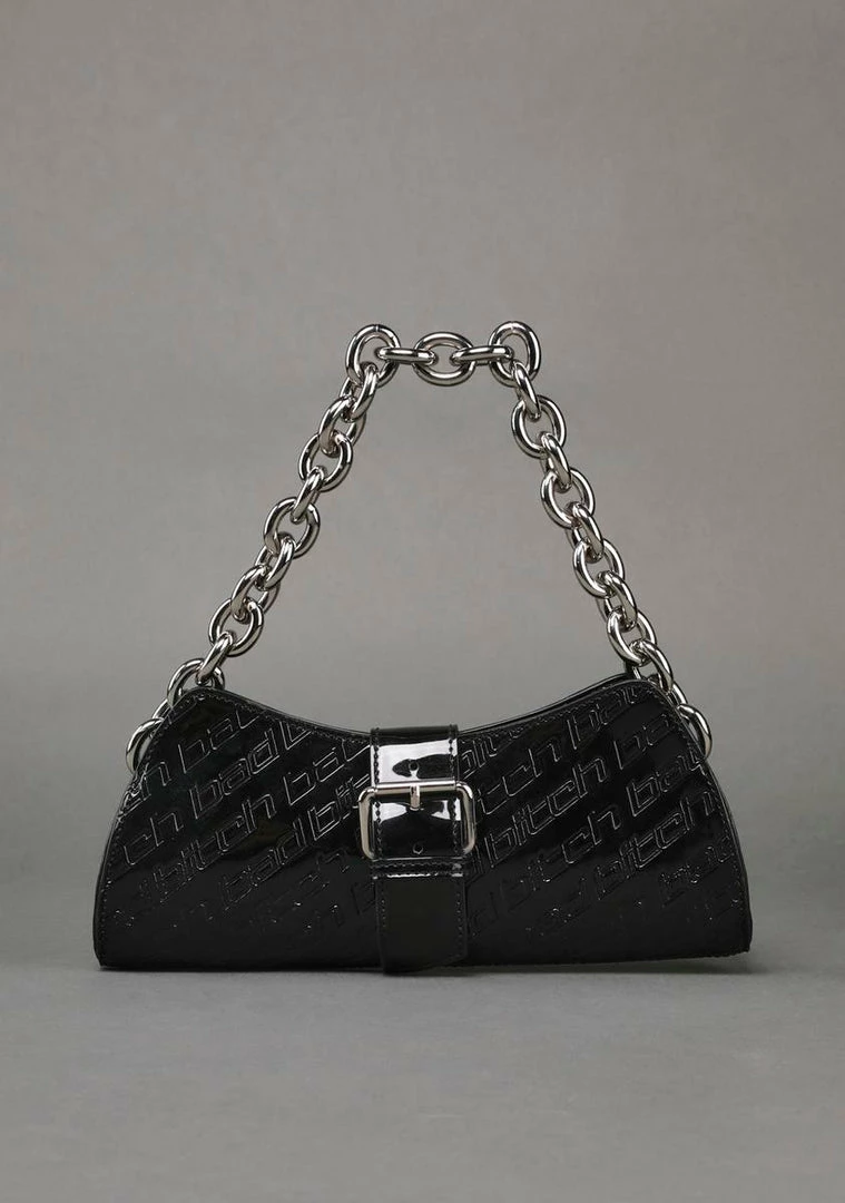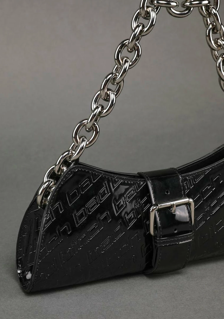 cuz chaos is your inner name. Engage the enemy with this shoulder bag that features a vegan patent leather construction, debossed “bad bitch” text all over, a magnetic button closure, a belted strap at front with a decorative buckle, a top zip closure, and a chain shoulder strap.