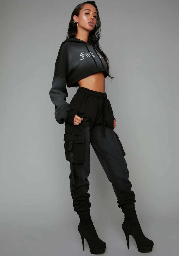 cuz I do what I want, when I want. These DGAF jogger pants appear more faded in person and have a fleece construction, a high drawstring waistband, and cargo pockets with snap buckle closures.