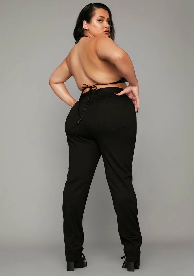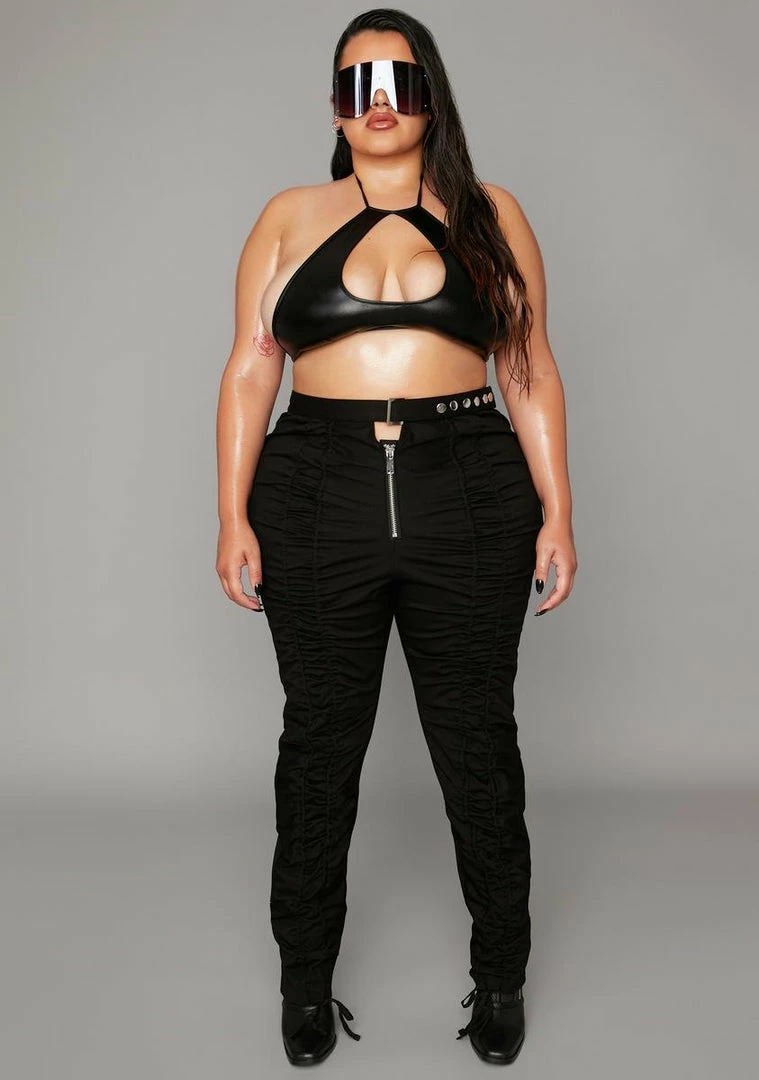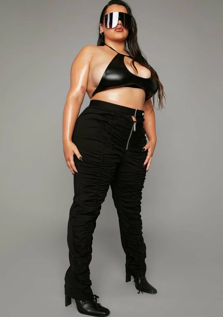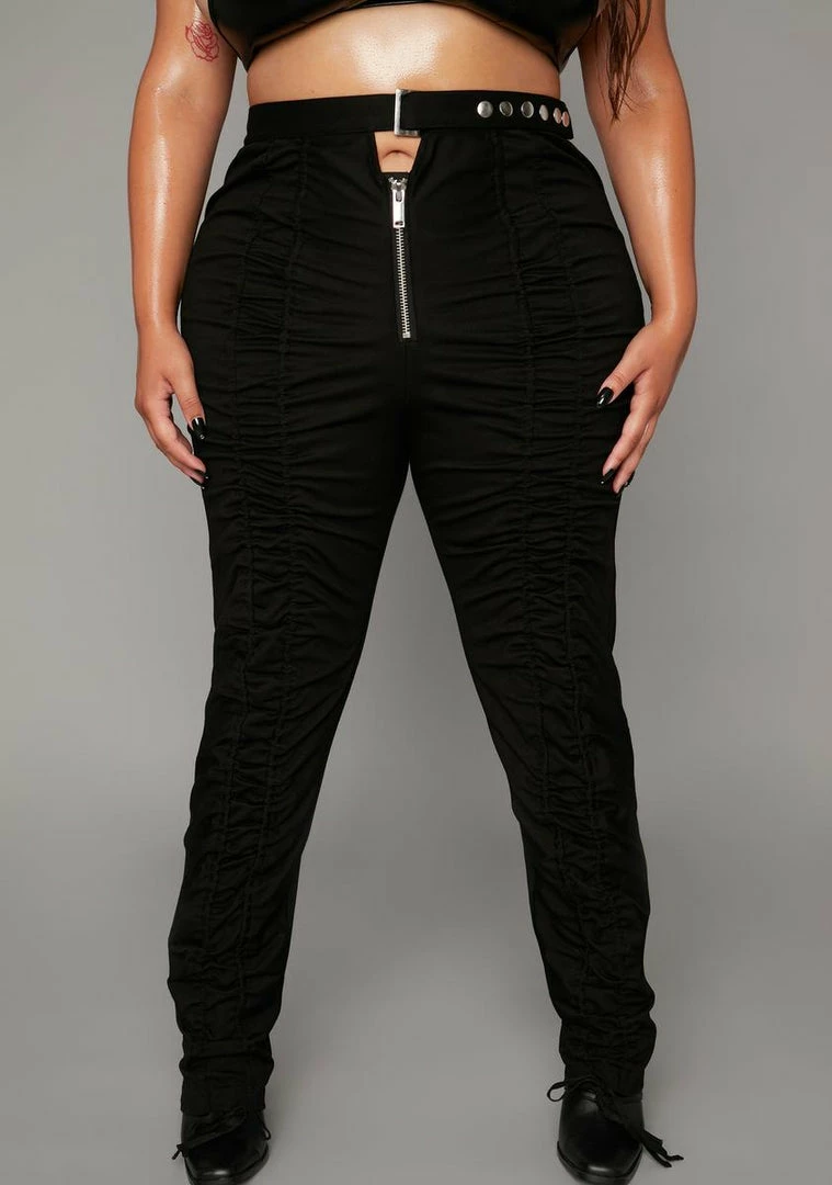 so you can remind them whoâs on top. These ruched pants have a skinny leg fit, high waisted design and utility buckle closure at the waist.