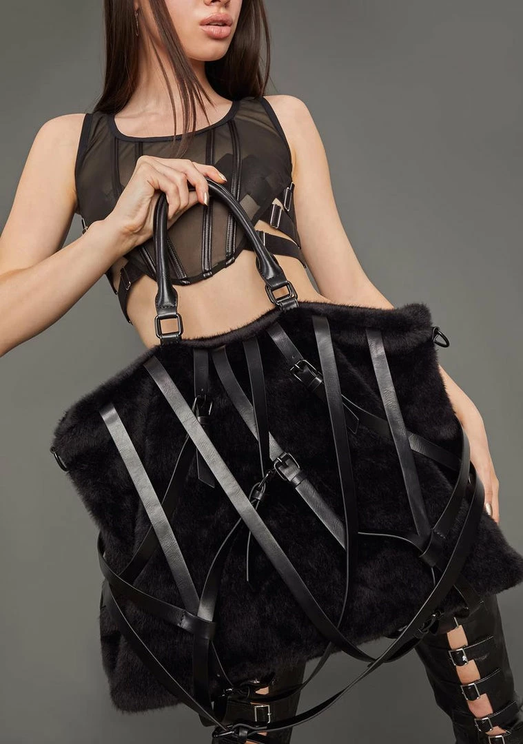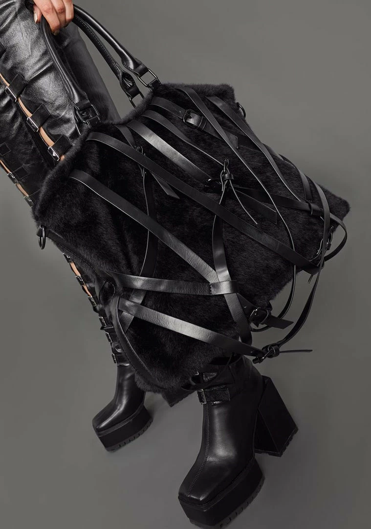 cuz you’re in for a wild ride. This roomy weekender bag has a faux fur construction, vegan leather buckle straps all over, a top zip closure, and comes with an adjustable shoulder strap.