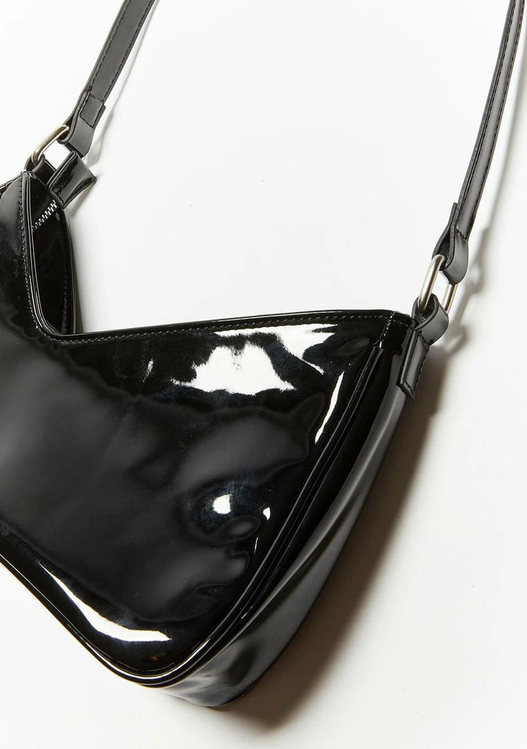 gotcha breakinâ the bank, bb! Wake up feeling like money with this sleek baguette shoulder bag that has a smooth patent leather construction, an asymmetrical design, and a top zip closure.