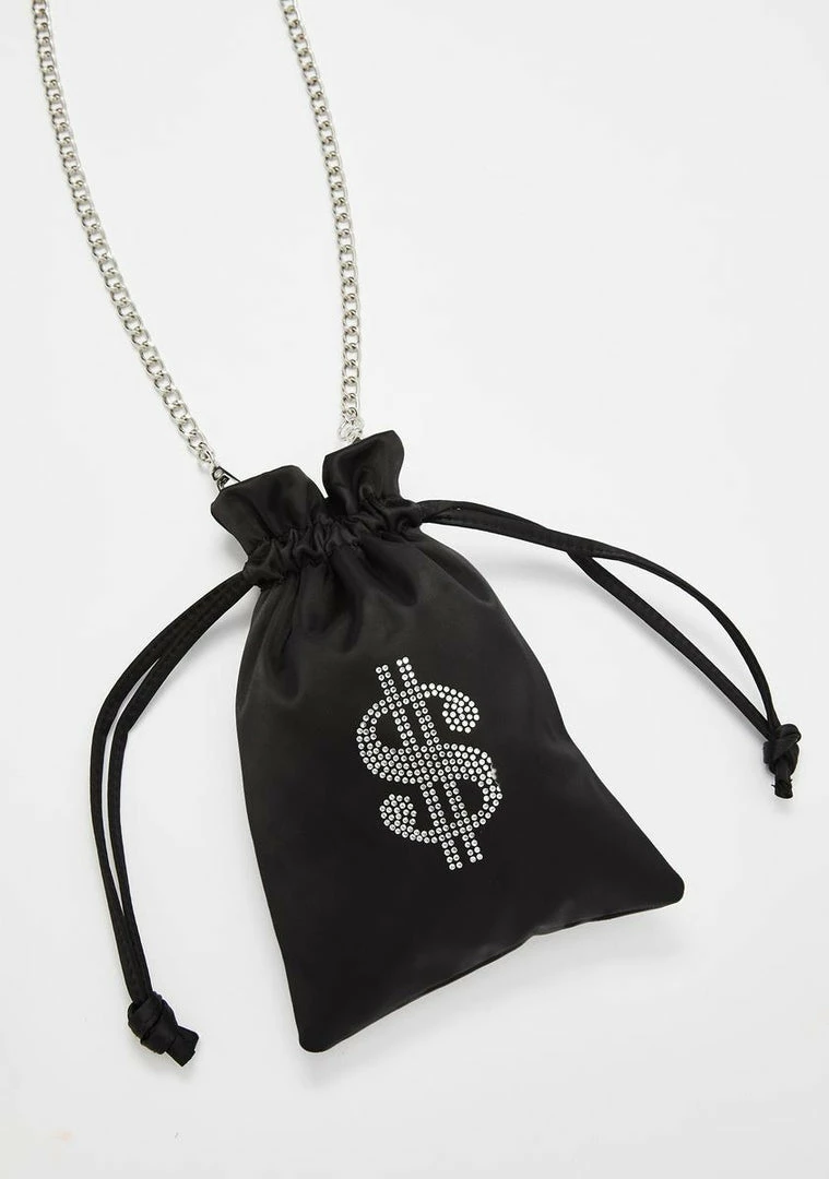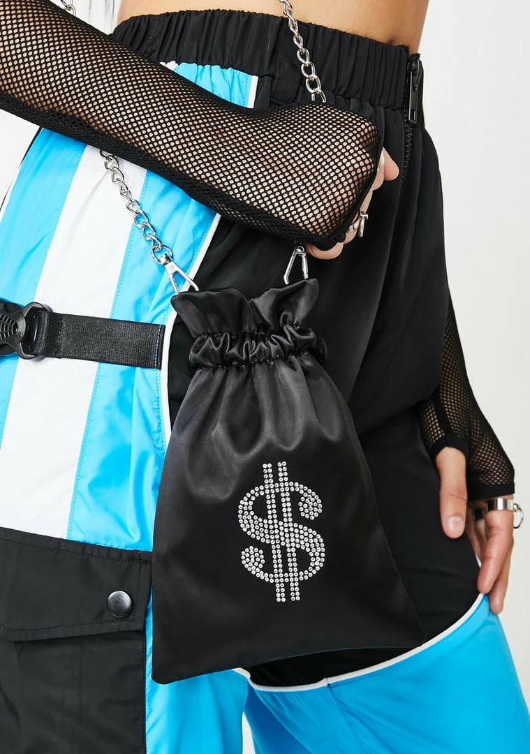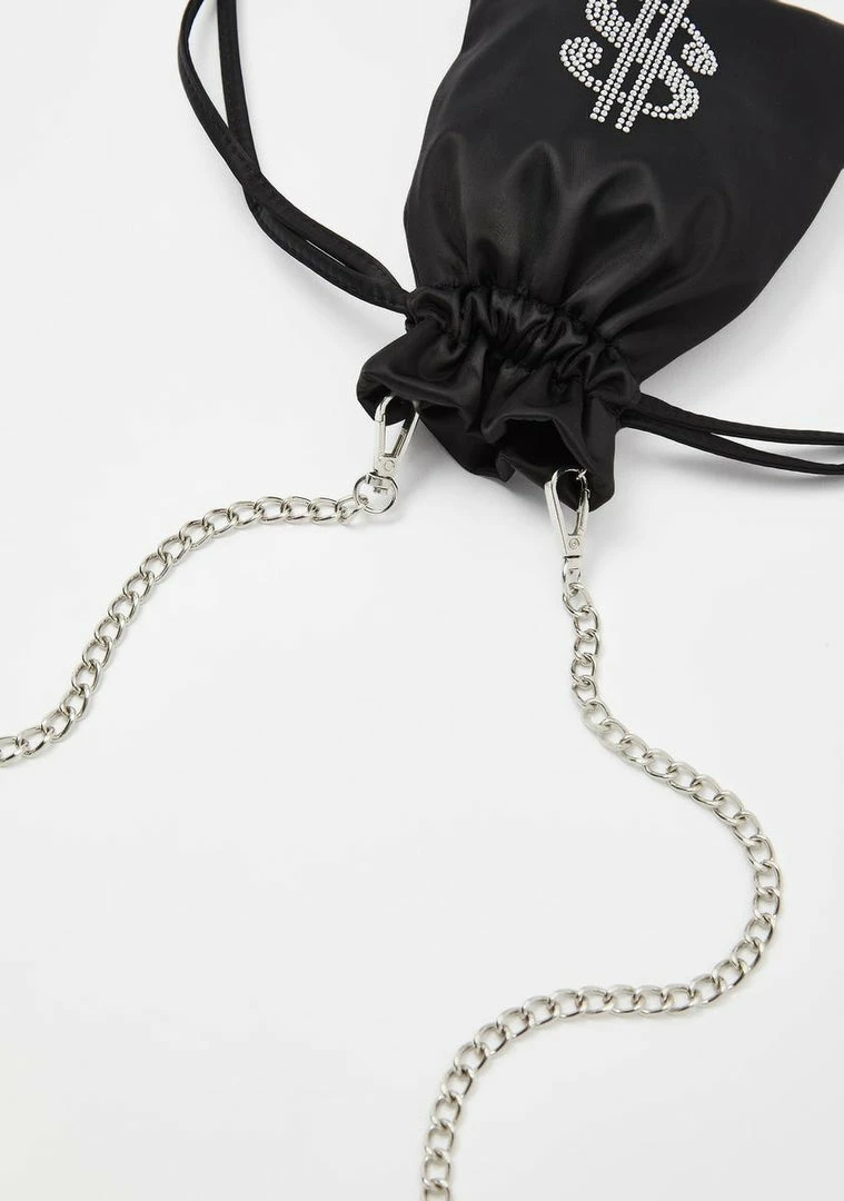 cuz youâve got all the riches, hunny! Youâre all about the money in this satin pouch bag that has a detachable chain crossbody strap, drawstring closures, N’ a rhinestone studded dolla sign on the front.