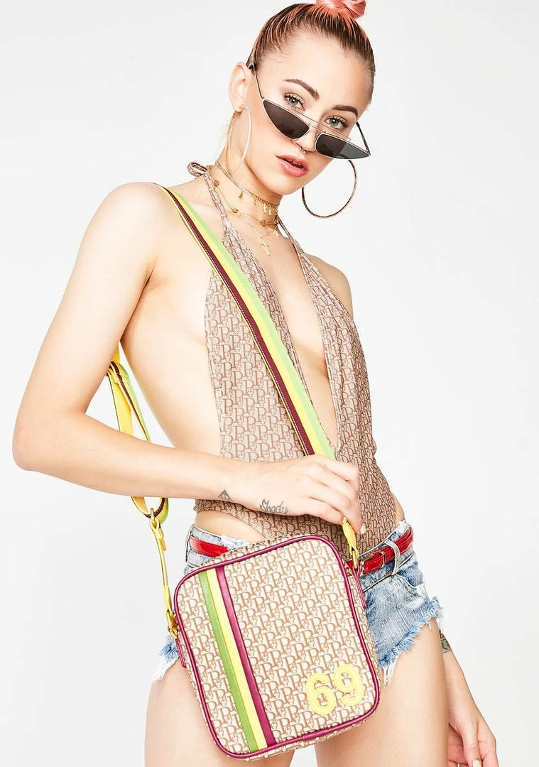 cuz youâre in love with Mary Jane! Sheâs not the type to play games in this dope crossbody bag that has PG print and vegan leather trim all ova, vegan leather â69â applique detail on the front, a striped shoulder strap, two interior pockets and a zip closure.