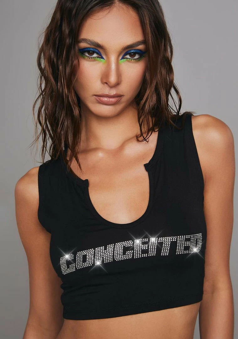 what do you mean the world doesn’t revolve around me? This soft and stretchy tank top has a cropped fit, a notched neckline, and a ‘conceited’ rhinestone graphic on the front.