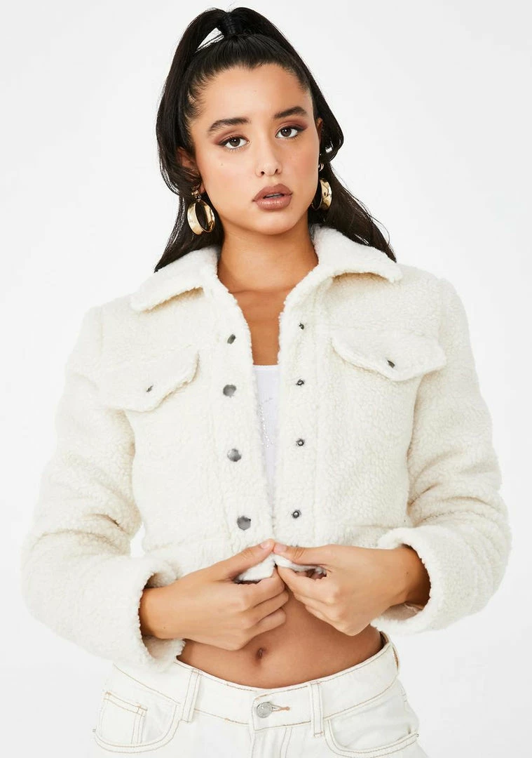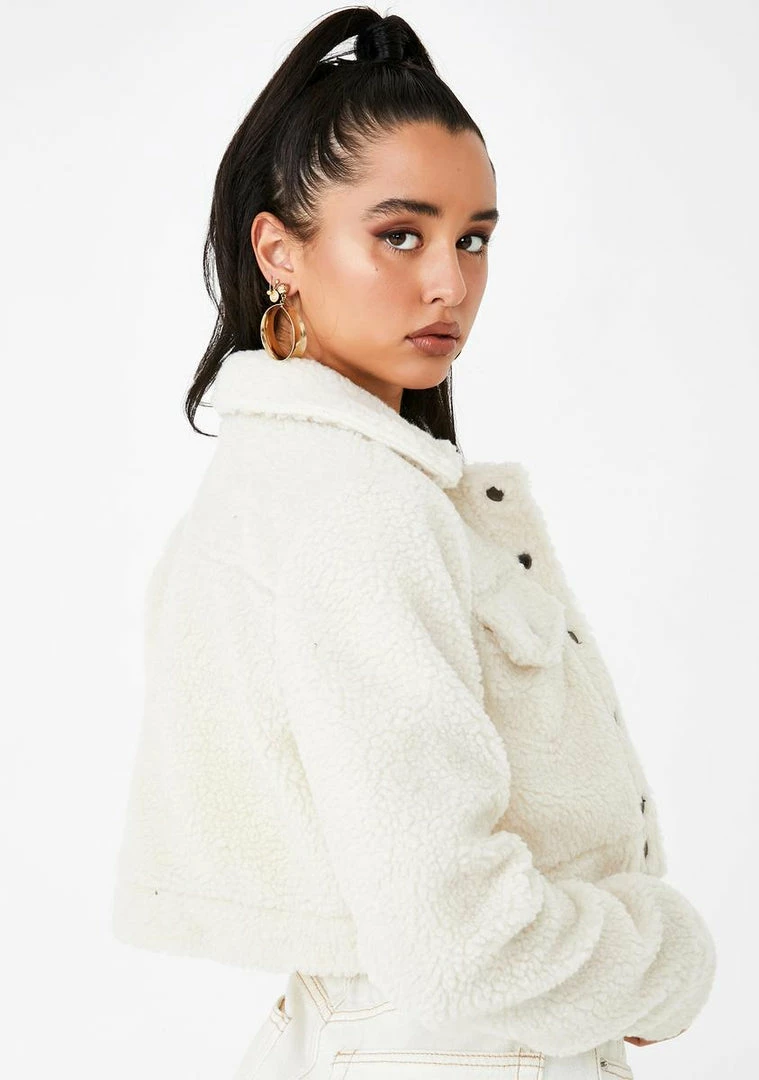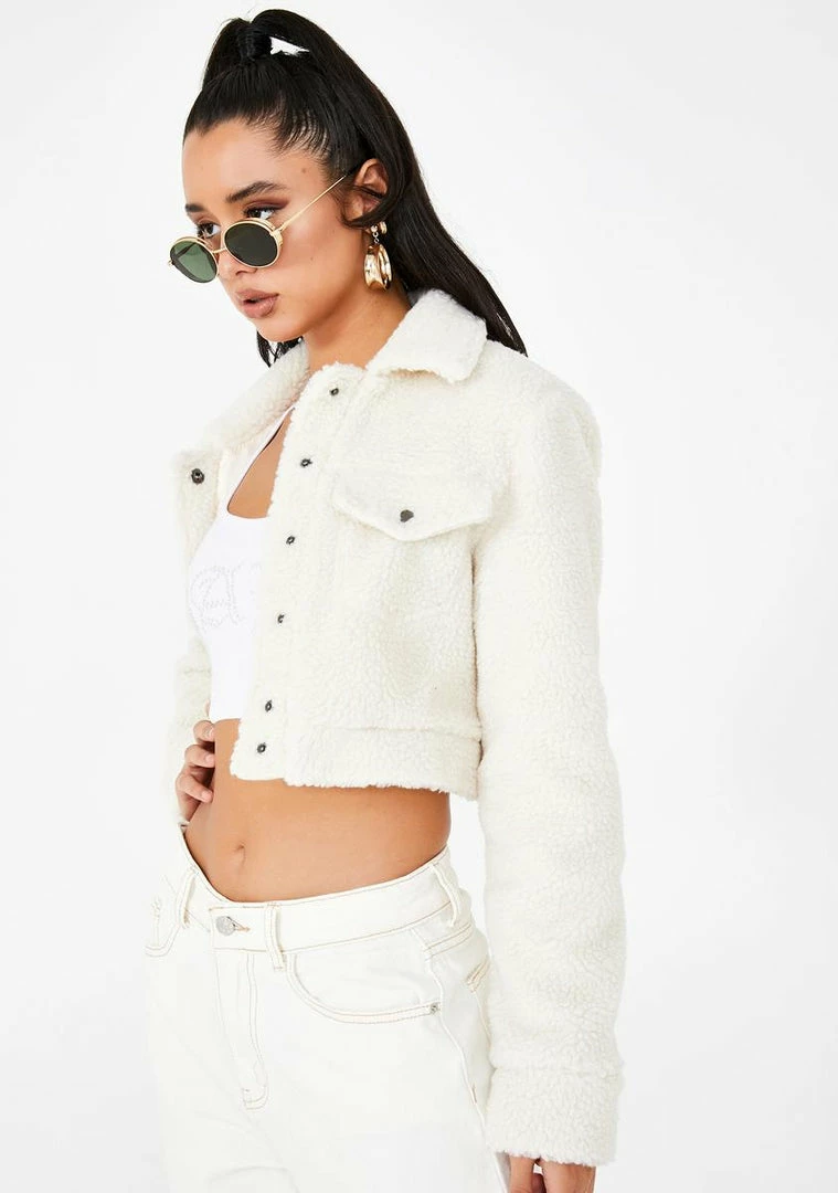 got ya lookinâ like yew own the place, bb girl. Youâre the latest obsession in this dope AF cropped jacket Nâ purse set that has a supa fuzzy construction, a chrome chain shoulder strap and button up Nâ zip closures.