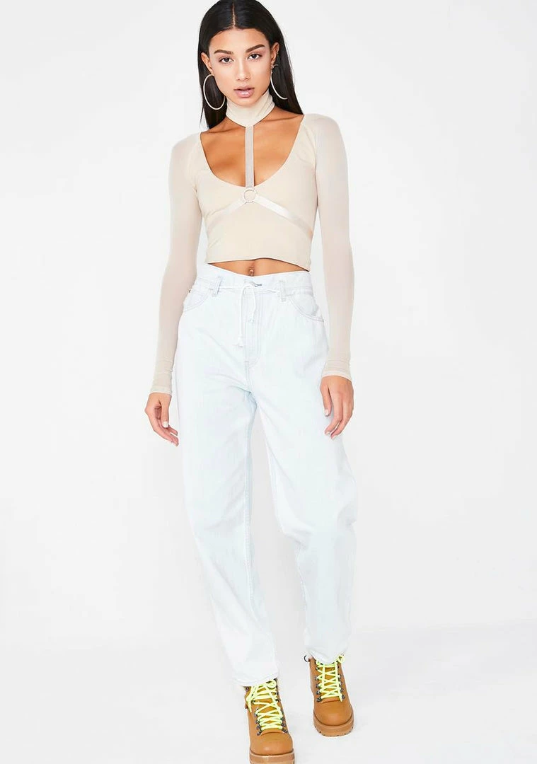 cuz you got âem so excited babe. They canât keep their hands off ya in this crop top that has a scoop neckline, sheer sleeves, Nâ a thicc choker with strappy deetz.