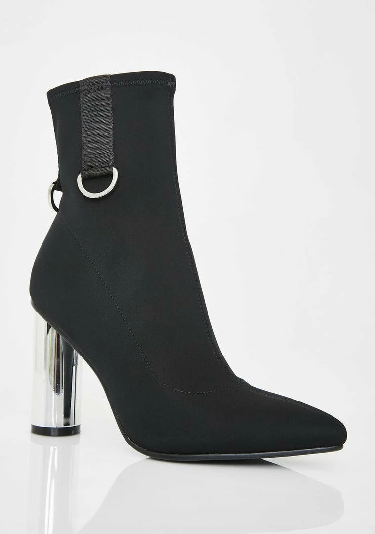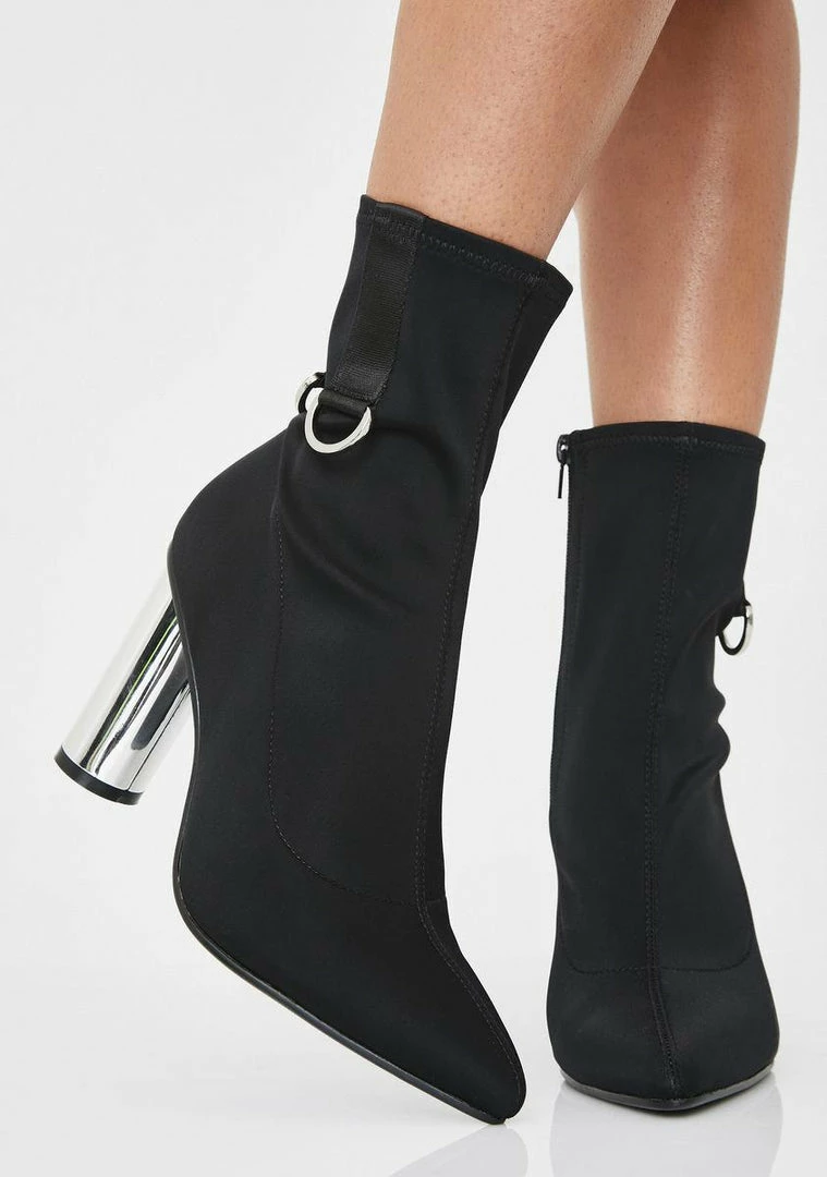 cuz you stay at the numba one spot! They stay envious in these baddie approved ankle boots that have a neoprene construction, D-ring hardware, side zip closures, and chunky chromed out heels.