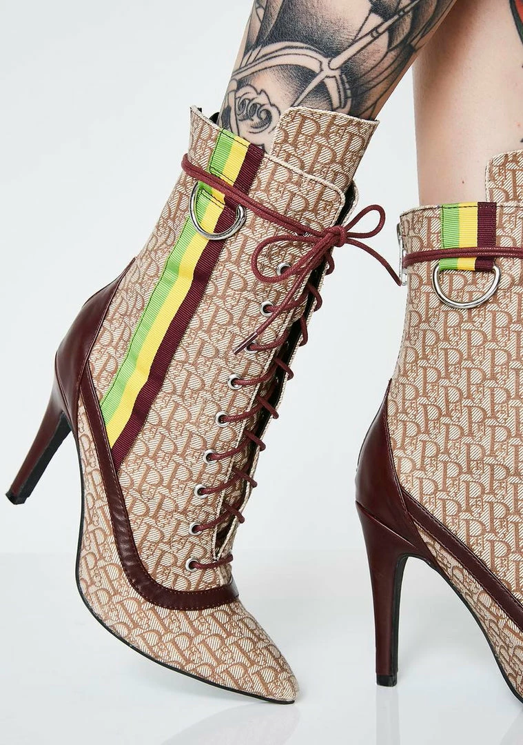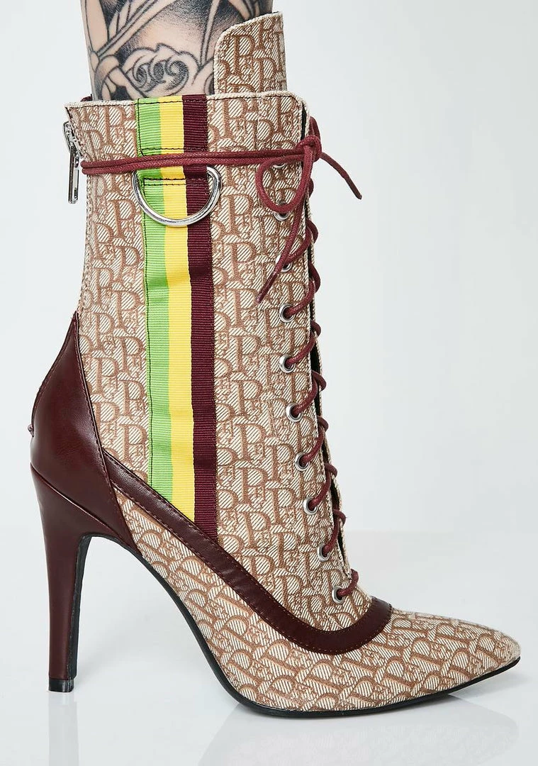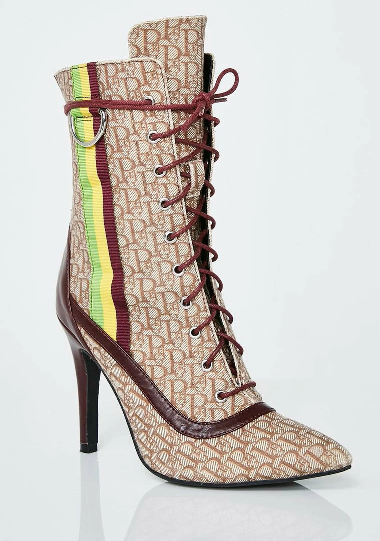 cuz ya tiptoe any Nâ everywhere. Try to keep it PG in these ca$h schmoney booties that have a PG logo print all ova, pointed toes, a multitone side stripe detail with D ring, and a lace-up Nâ zip closure to have ya feet on fleek all night bb.
