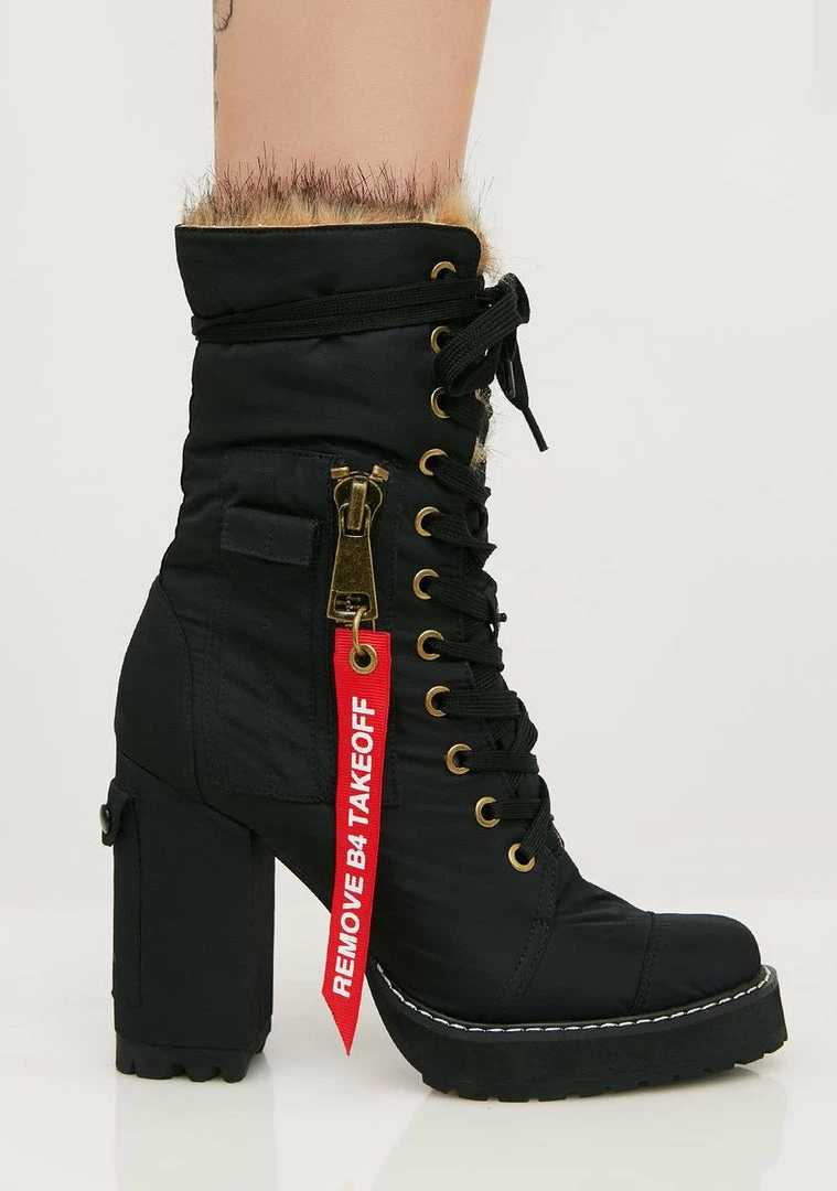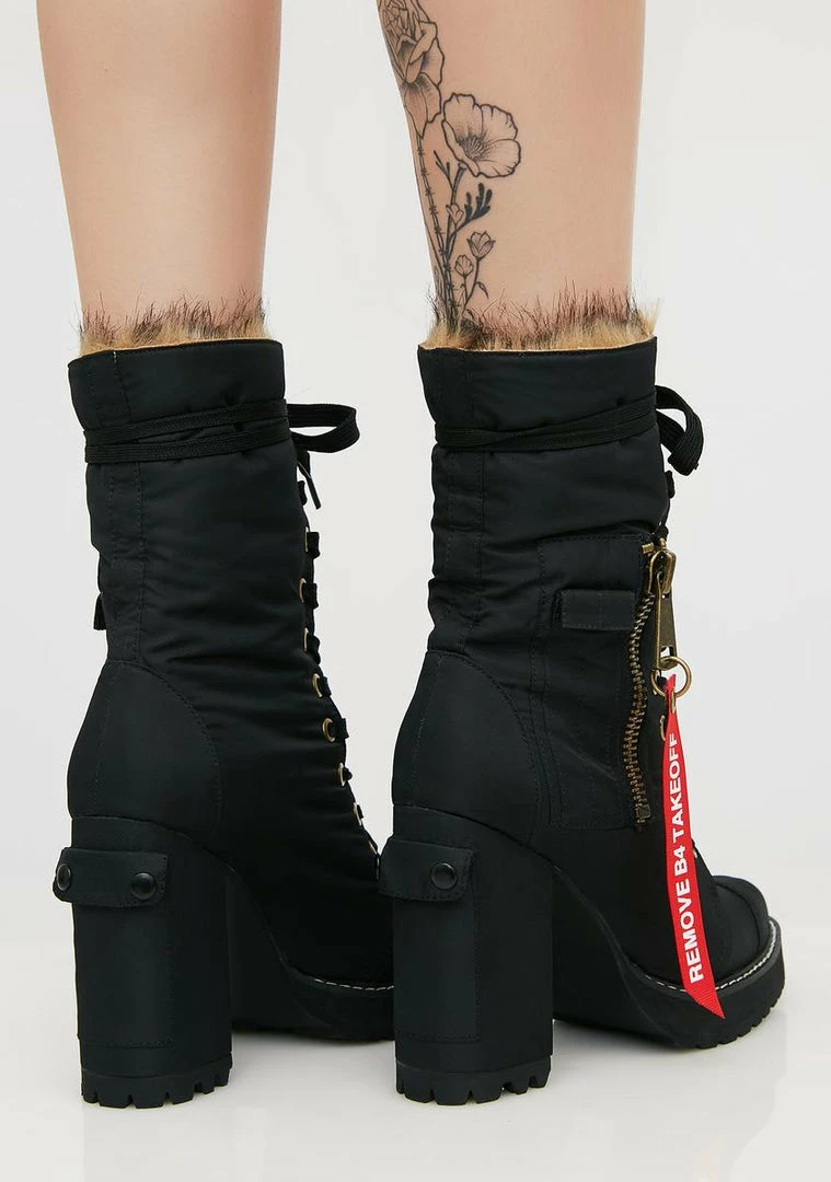 cuz thereâs no limit for ya. These black boots have chunky heels, front lace up closures, and cozy faux fur lining inside.