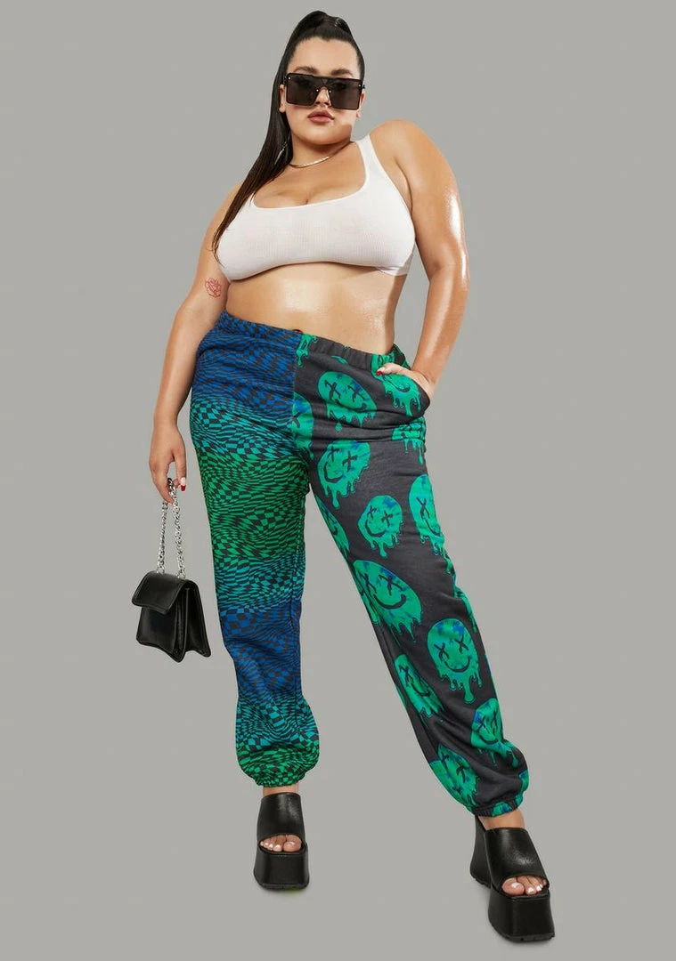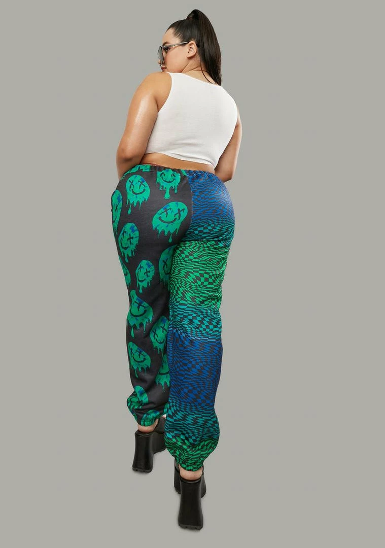 cuz you are ready for your trip. These joggers have pockets with a slime smiley and trippy checkered two-tone print all over.