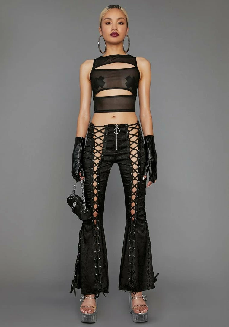 because you take control. These bell bottom pants are flared with lace up detailing on the front with a zipper closure.
