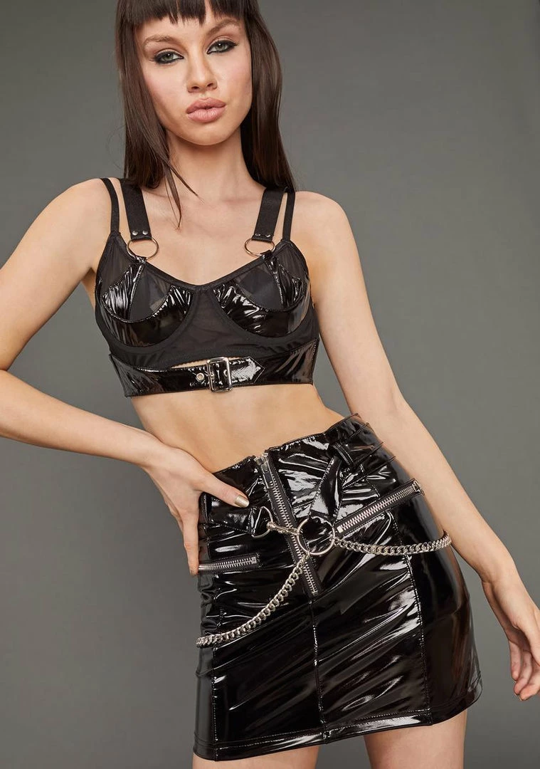 cuz theyâre not worth your precious time. This patent mini skirt has a high waist fit, a front zip closure and O-ring chain details.