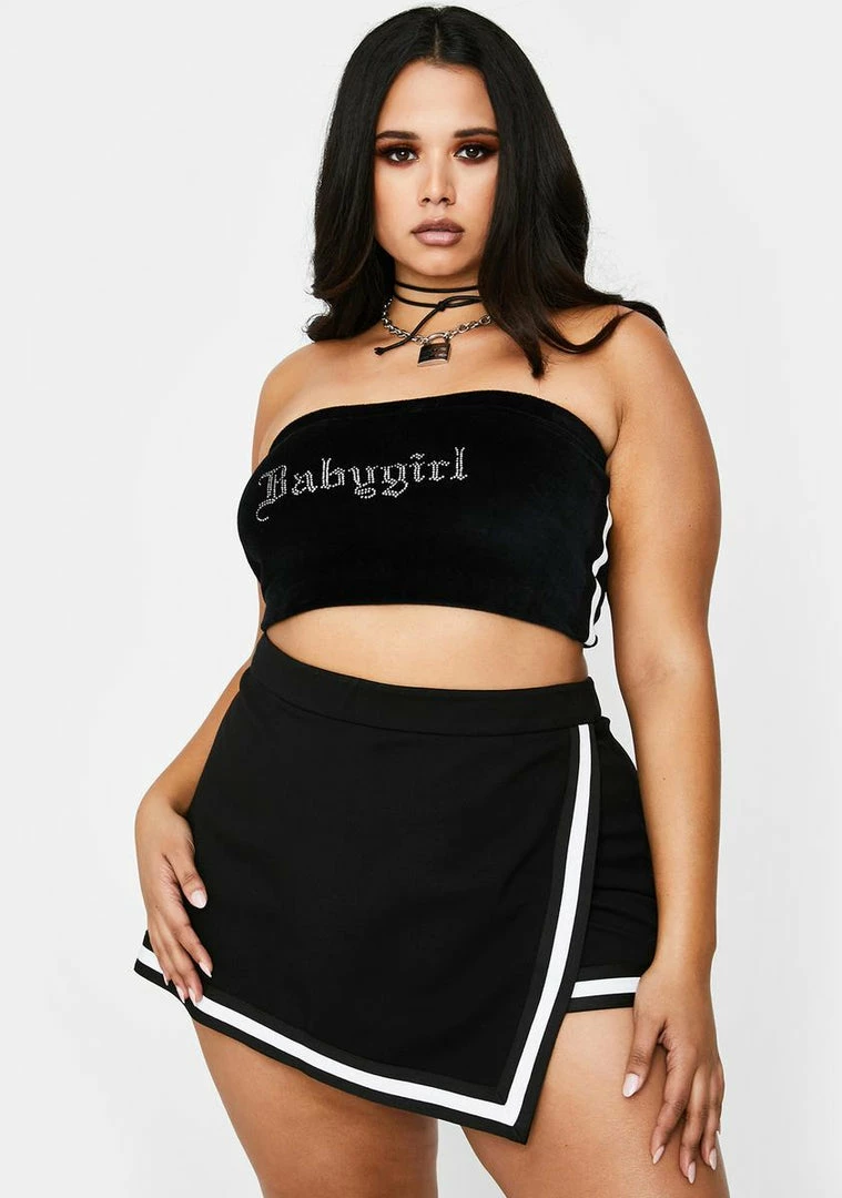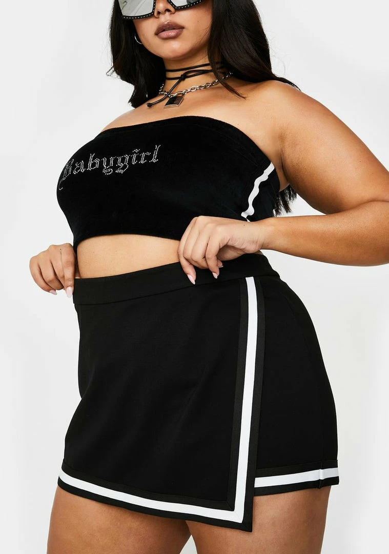 donât hate me cuz Iâm beautiful! Hate me cuz you ainât me in this bodied high waist mini skort that has a supa stretchy waistband, contrast stripe trim, back O-ring zip closure Nâ front wrap construction.