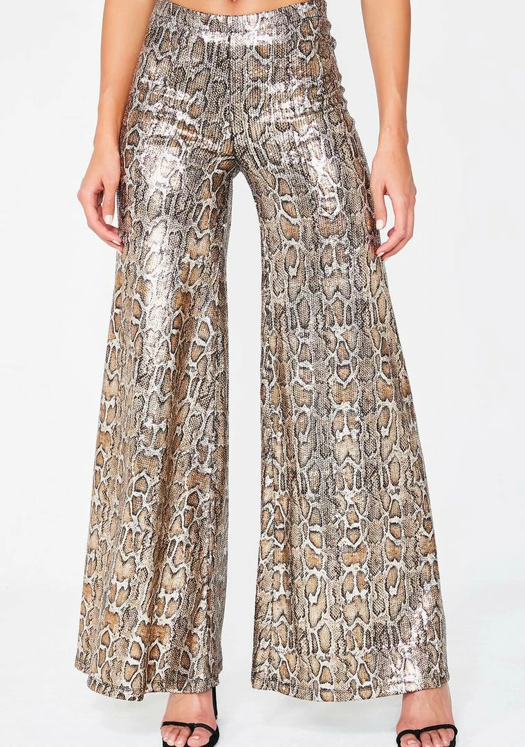 will have ya lewkinâ VIP AF! Strut down the red carpet in these sexxy snakeskin pants that have a wide leg fit, zip closure, and sparkly sequins all ova.