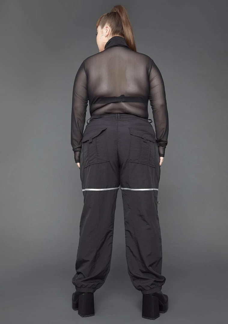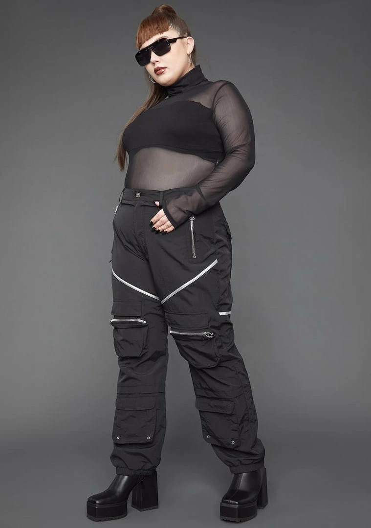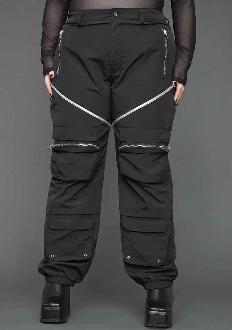 you keep your cards close to your chest. These high waist nylon cargo pants have a relaxed fit, exterior pockets with zipper and snap button closures, and elastic ankle cuffs.