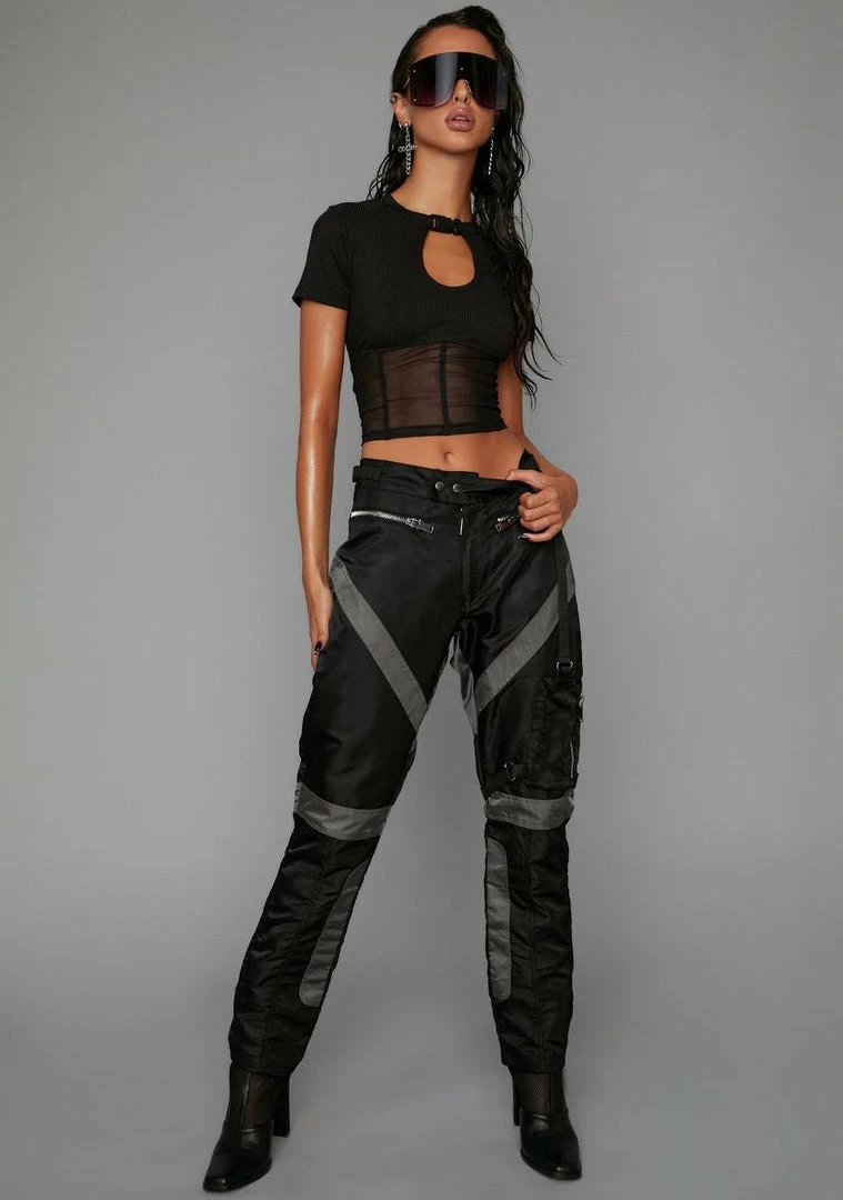 youâre not afraid. This crop top has short cap sleeves, a sheer bodice with corset seams and a soft ribbed knit bust that features a utility buckle cut out.
