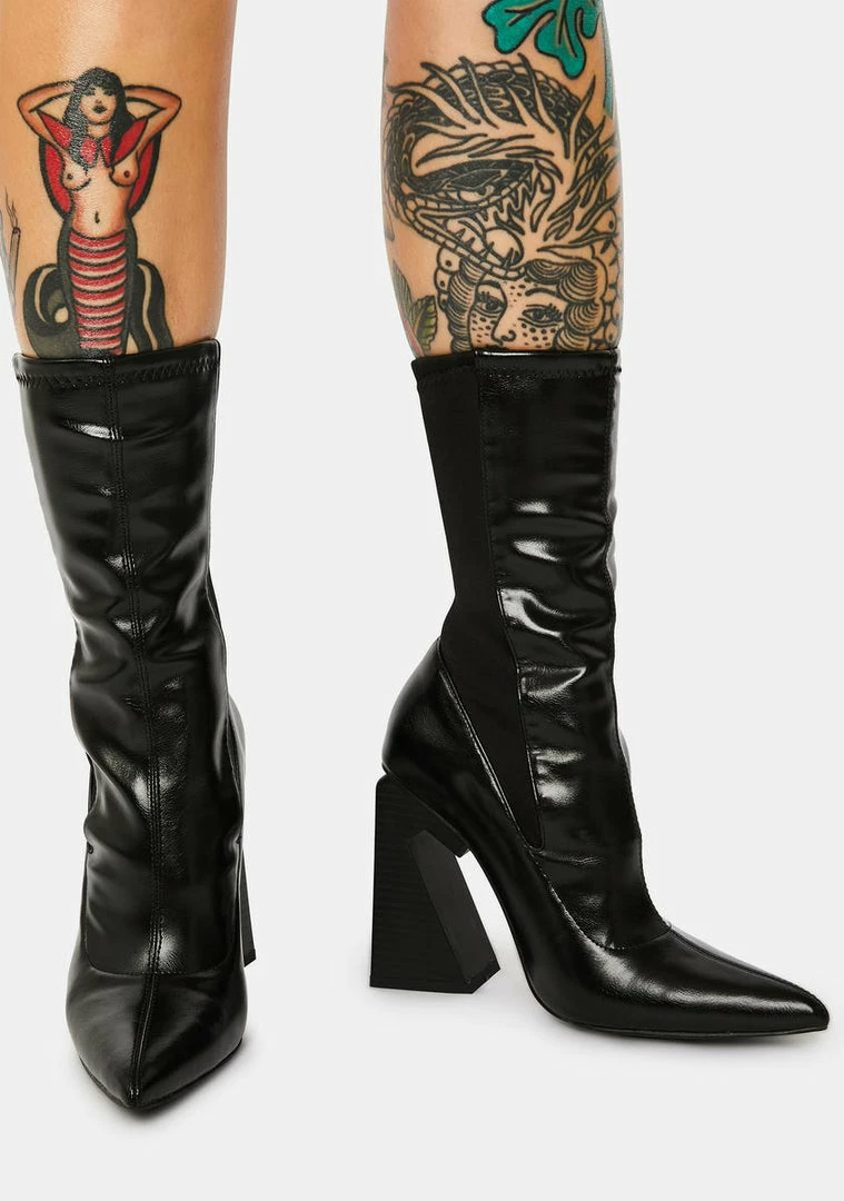 cuz you can be mean when u wanna. These ankle boots are patent leather with a pointed toe and square heels.