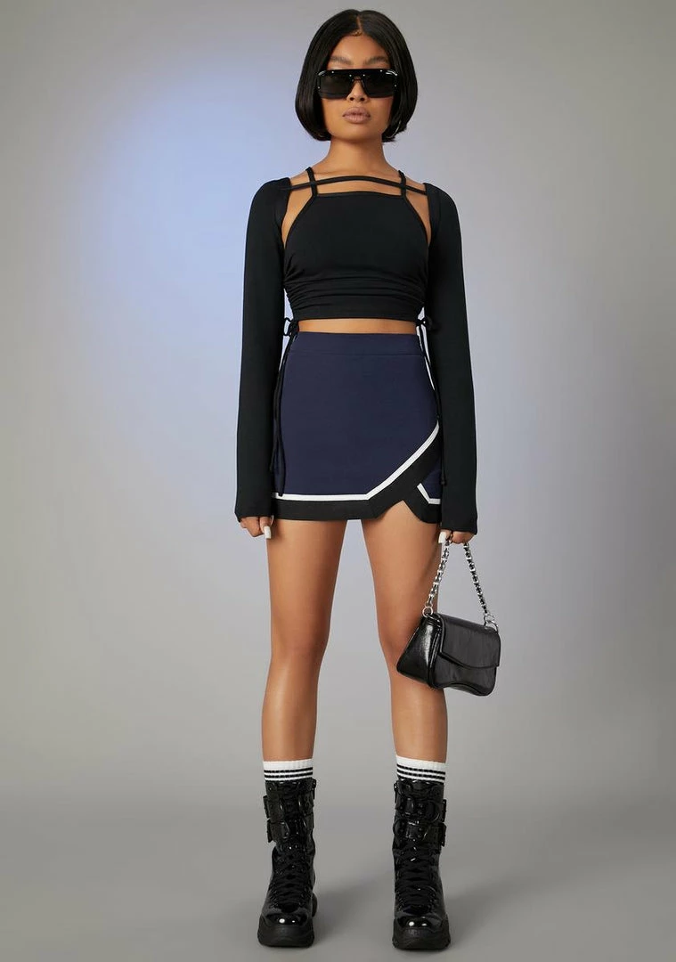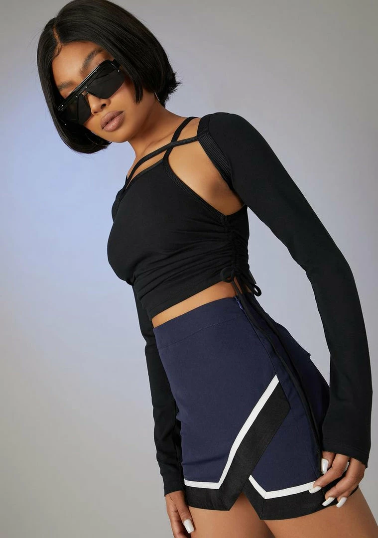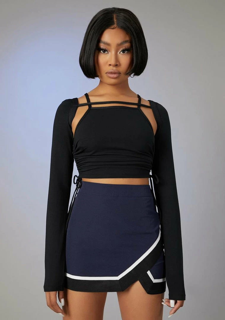 cuz your flight wonât wait any longer. Take off in this ruched cropped tank and matching shrug set.