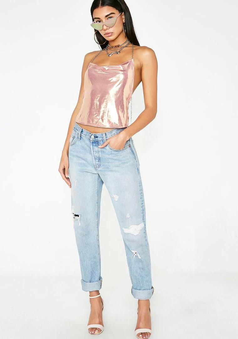 cuz youâre life isnât all diamonds and rosé, but it should be! Come thru drippinâ in this metallic slinky top that has a cowl neck and an open back with strappy chain deetz.