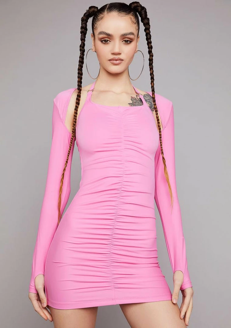 cuz we’re stuck in the past. This mini dress comes in a ruched construction, with a halter neck tie closure, o-ring details, long sleeves, and a back cut out.