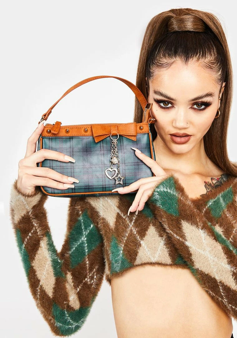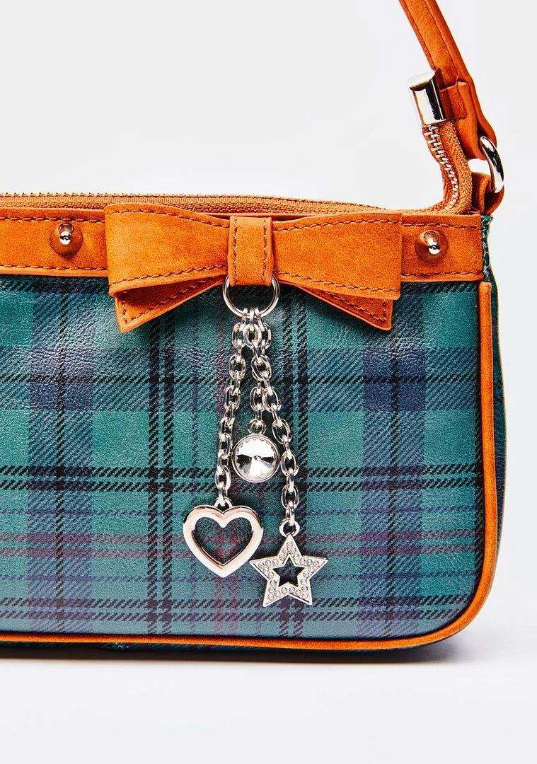 cuz ur queen of the quad. This shoulder bag has a plaid design, vegan leather trim with a bow detail, silver star and heart charms, stud embellishments, and a top zipper closure.