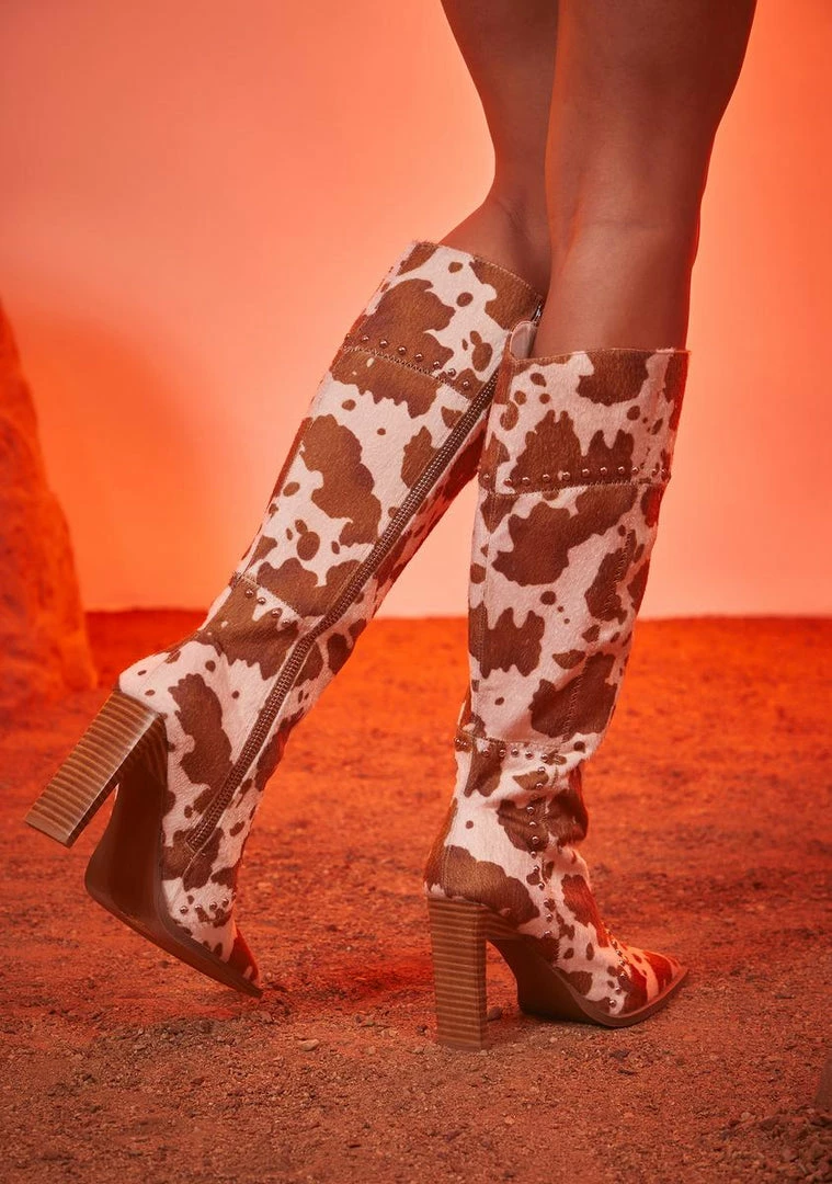 giddy up or go home. These rowdy knee high cowboy boots have a vegan cowhide construction with stud detailing, pointed toes, wooden block heels, and side zip closures.