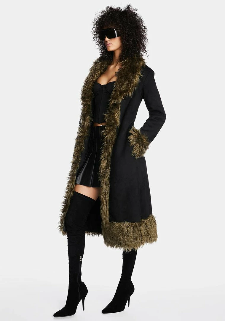 who cares what anyone else thinks? This midi-length jacket has a faux suede construction, faux fur trim, cozy fleece lining, long sleeves, side pockets, and a hook-and-eye closure at front.