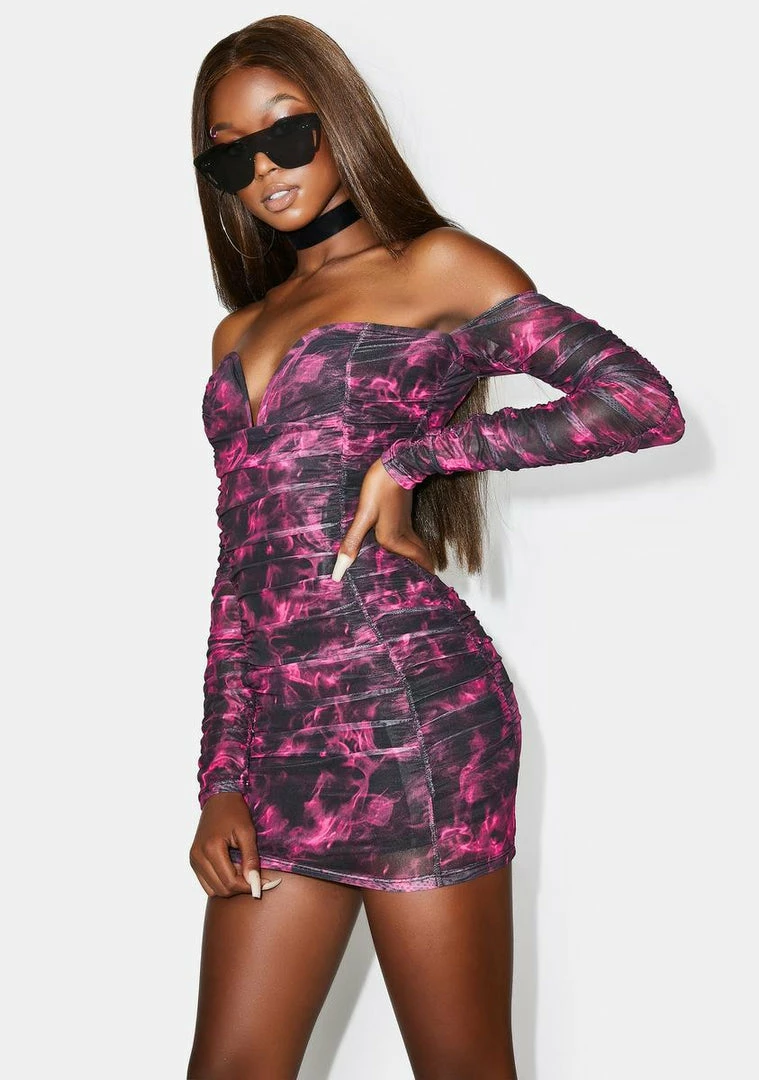 cuz youâve got people tossing the money and people doing the dance, which one will you be? Burn it all to the ground in this too hot to handle long sleeve bodycon dress that has a stretchy ruched construction with a hazy smoke print all ova and an off the shoulder sweetheart neckline.