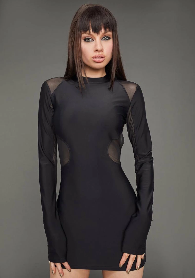 cuz off duty divas do whatever they want! This long sleeve open back mini dress has a strappy cut-out design, contrast mesh panels, a mock neckline and a bodycon fit.