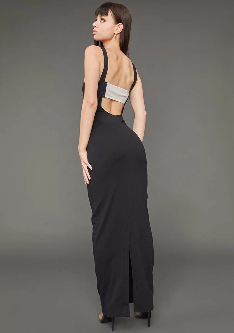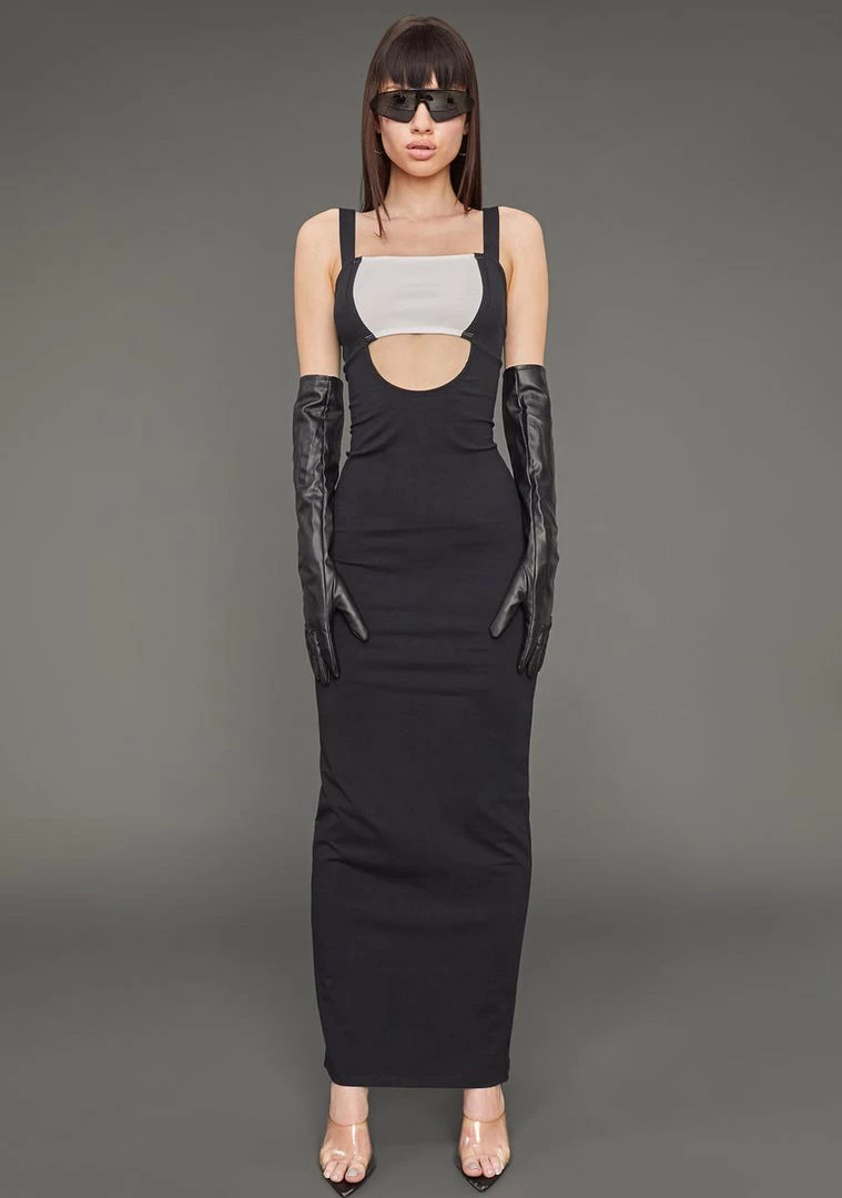 invoke their dark desires, babe. This bodycon maxi dress has contrast white panels and a cut-out design.
