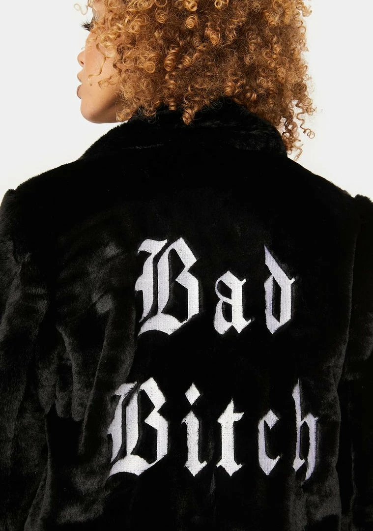 because some baddies are just born bossy. Get hotter in this trench coat with a longline fit, a faux fur construction, and “Bad Bitch” embroidered on the back and printed on the satin inner lining.