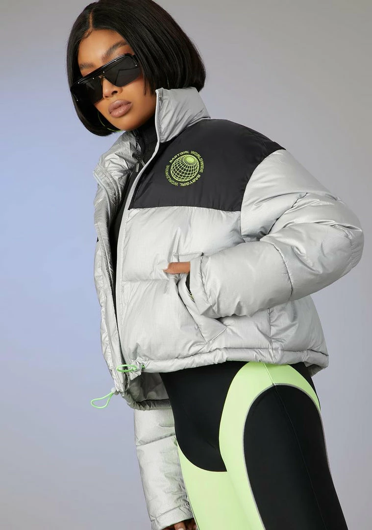 cuz youâre the queen of being chill. This puffer jacket is metallic with a logo and zipper closure.