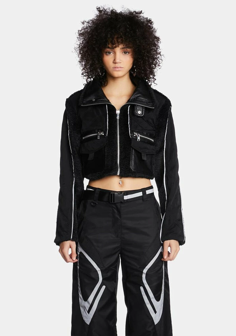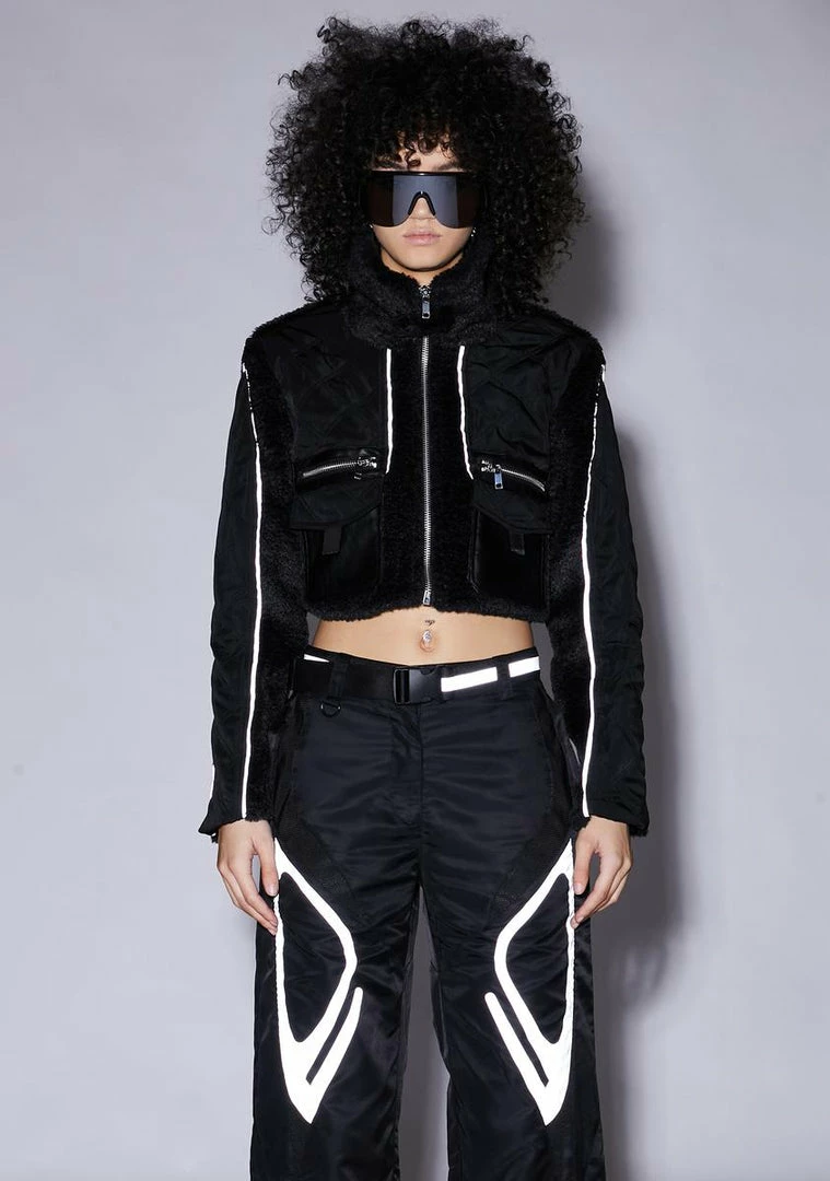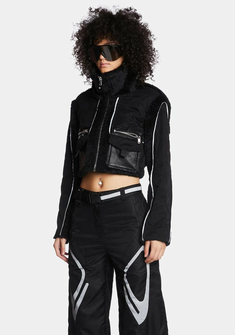cuz you are into forward thinking. This jacket has a silky lining, a faux sherpa and quilted nylon construction, vegan leather detailing, a collared neckline with snap buttons, long sleeves, reflective piping, decorative zippered pockets, a cropped fit, and a front zipper closure.