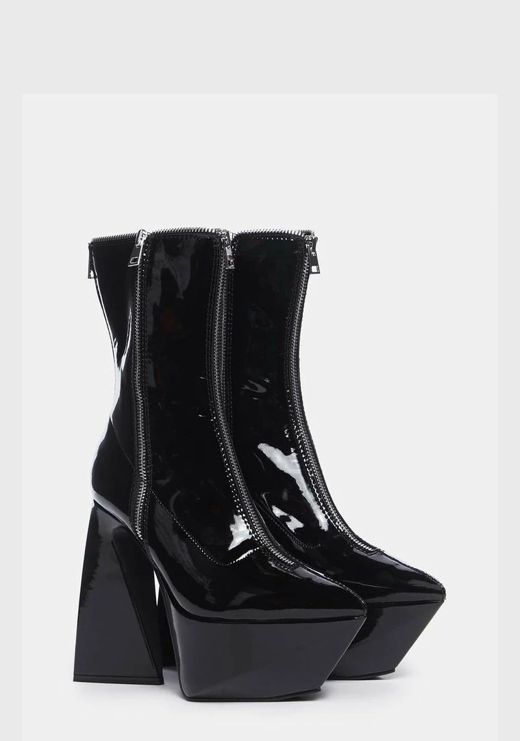 got you stuck in another dimension. These angular ankle boots have a patent vegan leather construction, an adjustable side zip and a decorative zip at top, pointed toes, chunky platforms, and flared block heels.