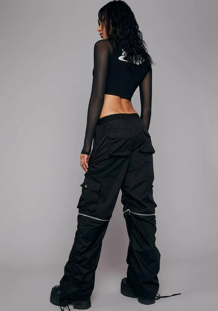you don’t shy away from a challenge. Come out on top in these wide leg pants have that a drawstring waistband, cargo pockets, a baggy fit, ruching details along the sides with adjustable ties, and zippers at the knees to remove the legs and convert into shorts.