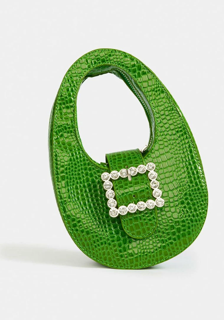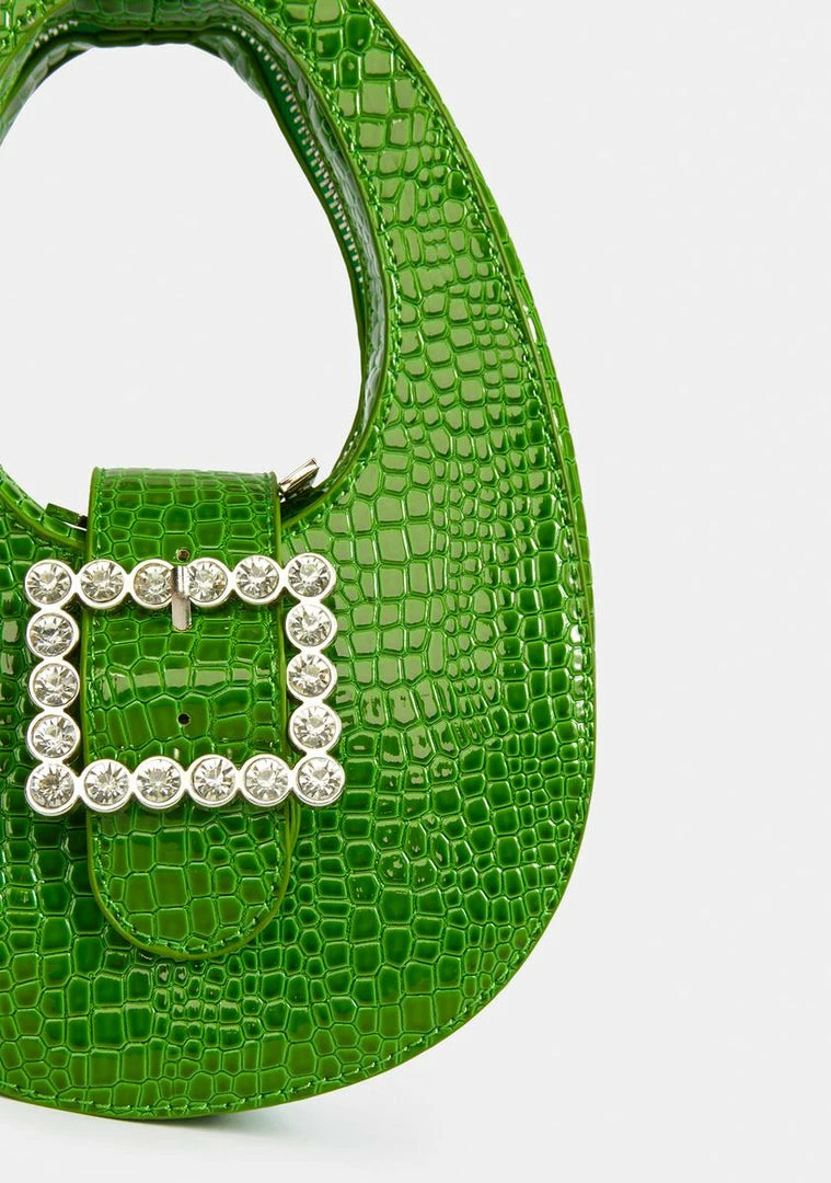 cuz you canât be tamed! This mini purse has a vegan leather construction with a croc embossed pattern and a rhinestone buckle strap on the front.