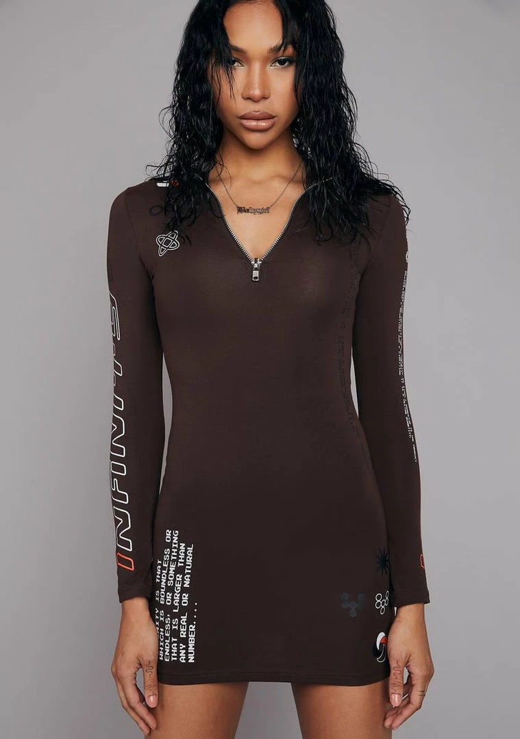 nothing is gonna stop you now. This mini dress has a mock neckline with a quarter zip detail, graphic text and logos printed across the front, back, and sleeves, and a bodycon silhouette.