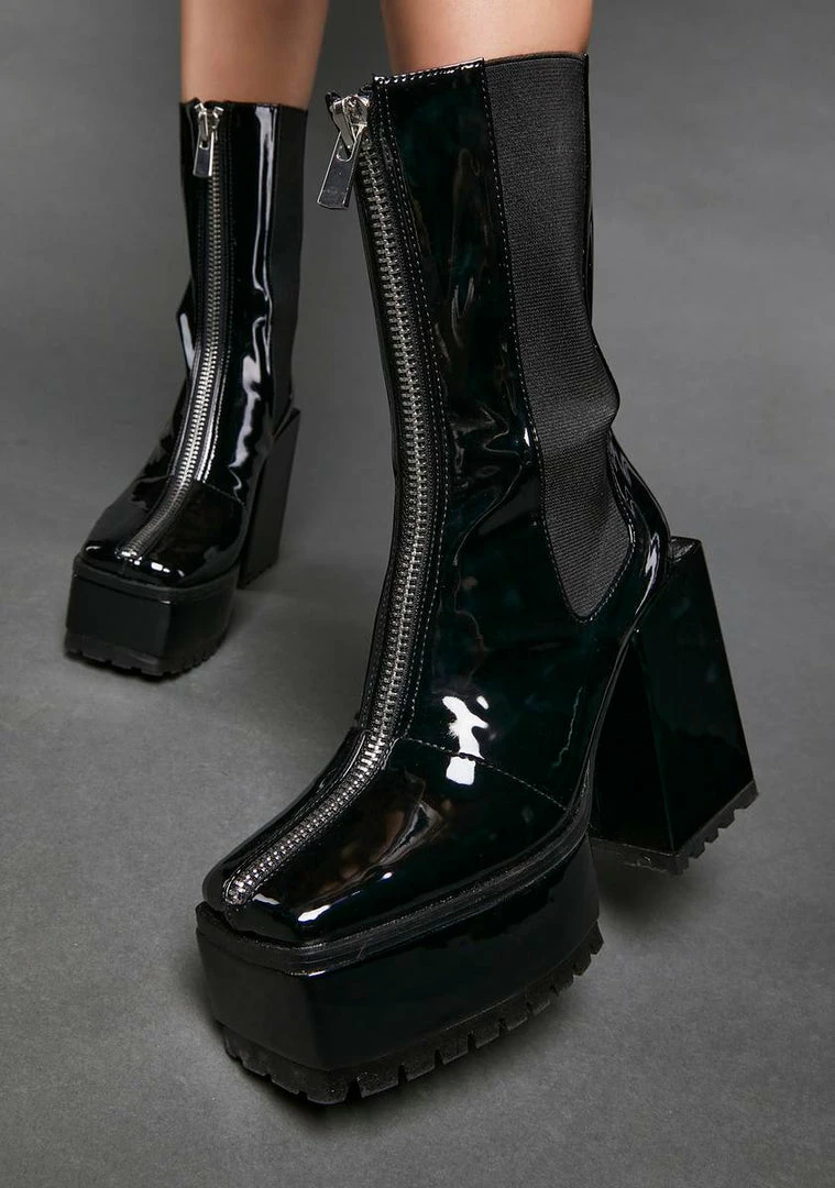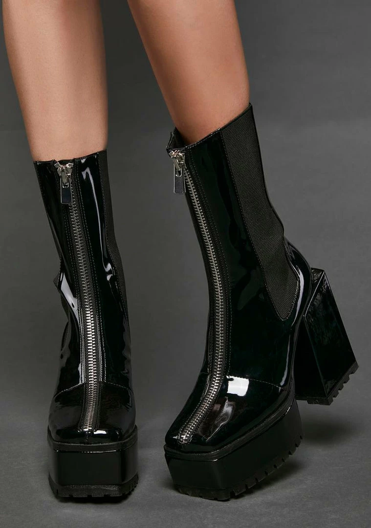 cuz we’re on an express elevator to hell. Dance with the devil in these calf-length boots that feature a glossy vegan patent leather construction, chelsea-style elastic panels at sides, front zip closures, and a future-forward chunky block heel.