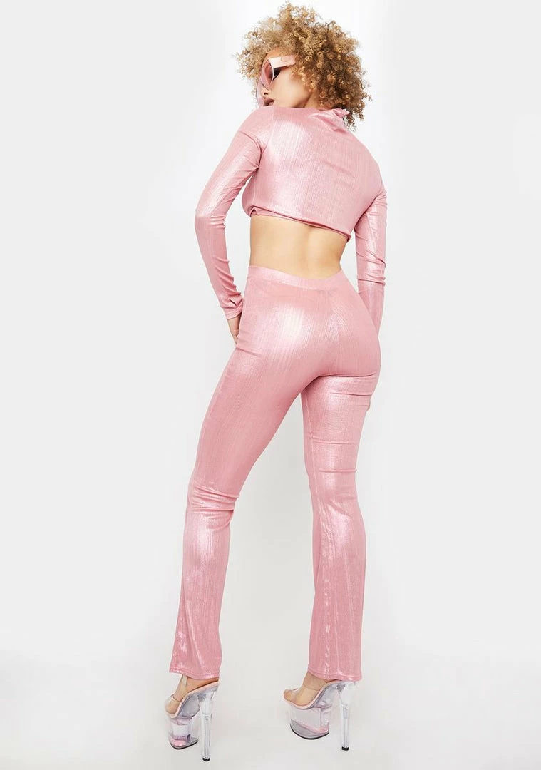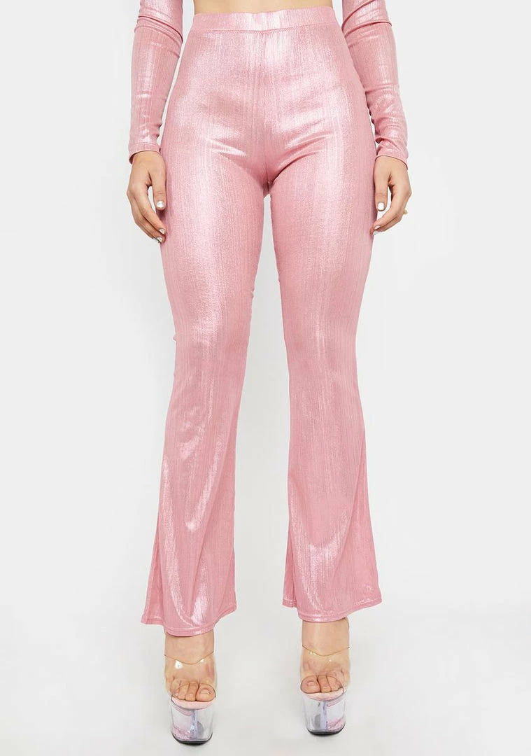 cuz you’re a snow bunny on skis. These metallic pull on pants have a high waist fit and a flare leg silhouette.