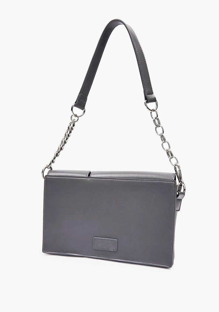 I’m all hung up on u. This shoulder bag has a vegan leather construction, detachable chain strap with a carabiner connector, and two pockets with foldover flaps that have metallic buckle closures.