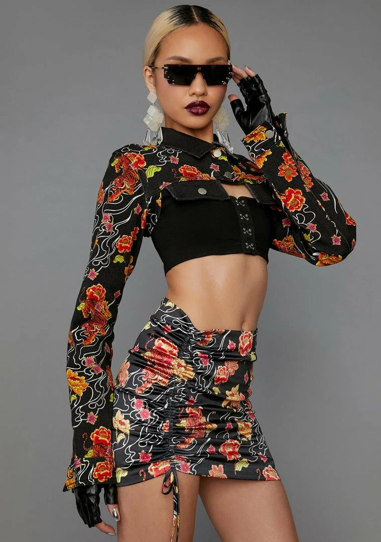 cuz you wear your heart on our sleeve. This twill shrug trucker jacket has a pointed collar, faux pocket flaps, and snap button closures.