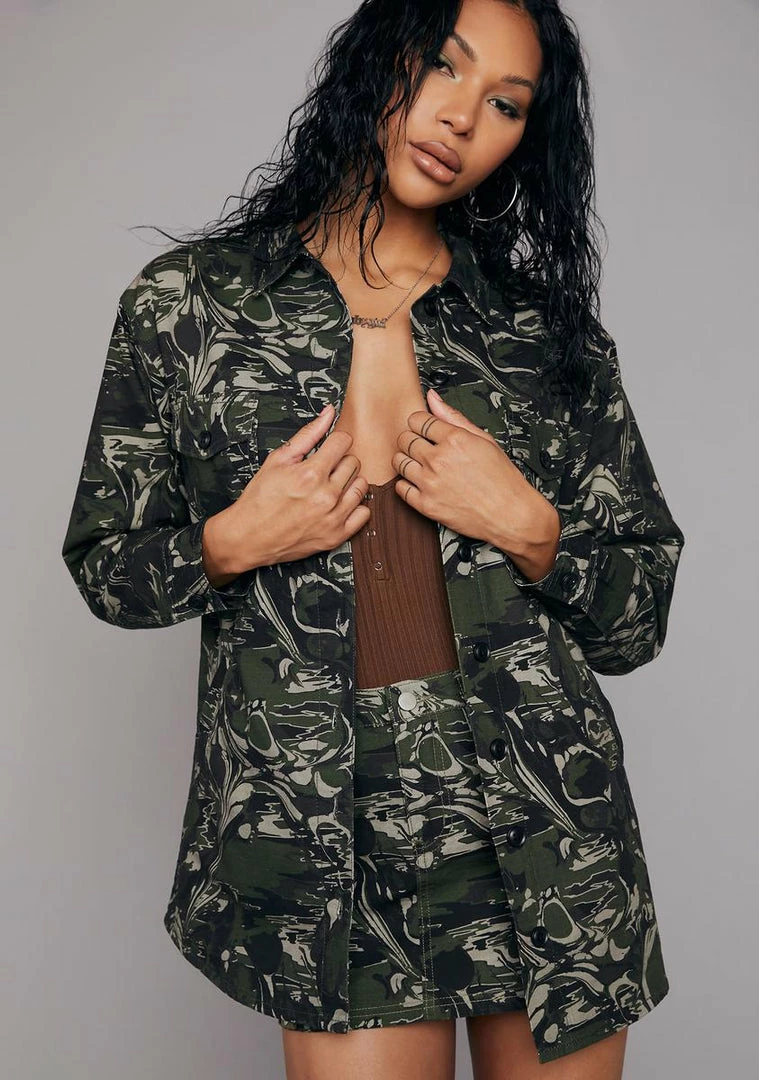 you gotta know who you’re dealing with. This jacket has an all over camo print, two breast pockets, contrast stitching, and button down front closures.