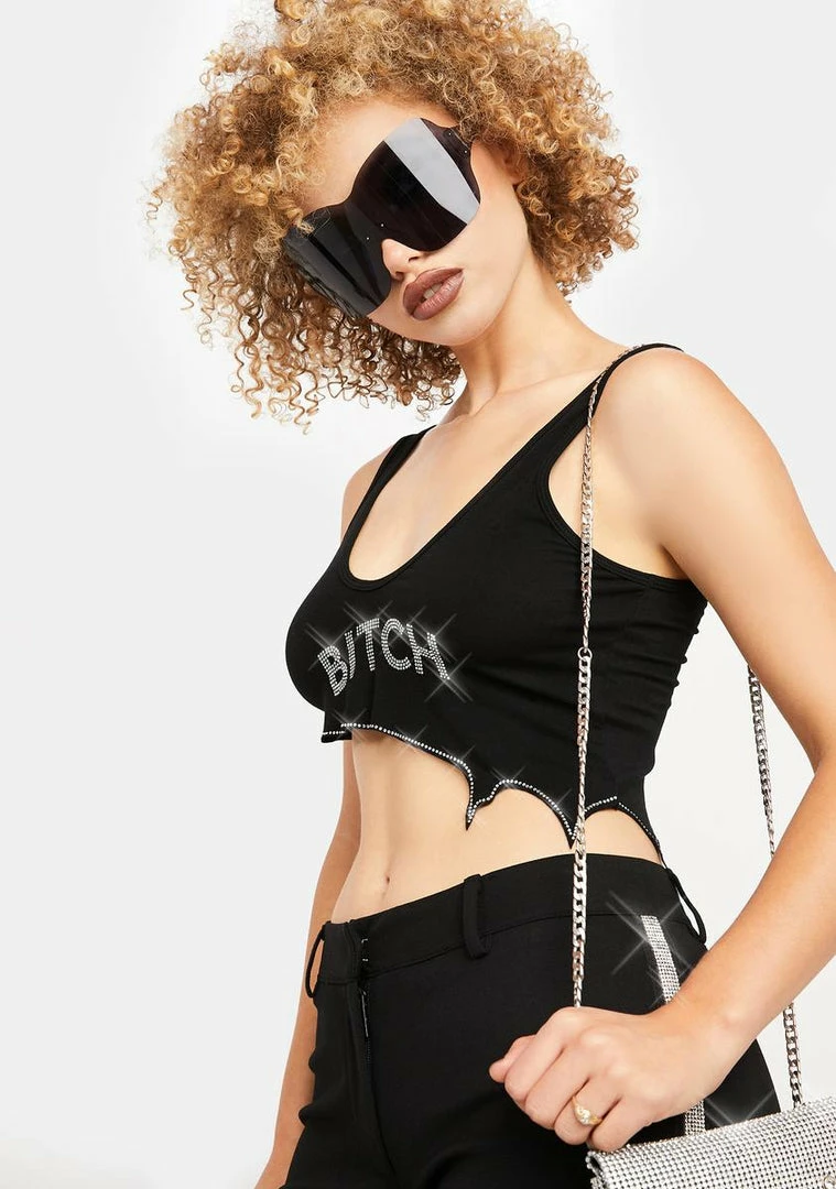 cuz youâre cold as ice. Give them the cold shoulder in this cropped tank top which has an asymmetrical distressed frayed hem with rhinestone trim and “bitch” rhinestone graphics on the front.