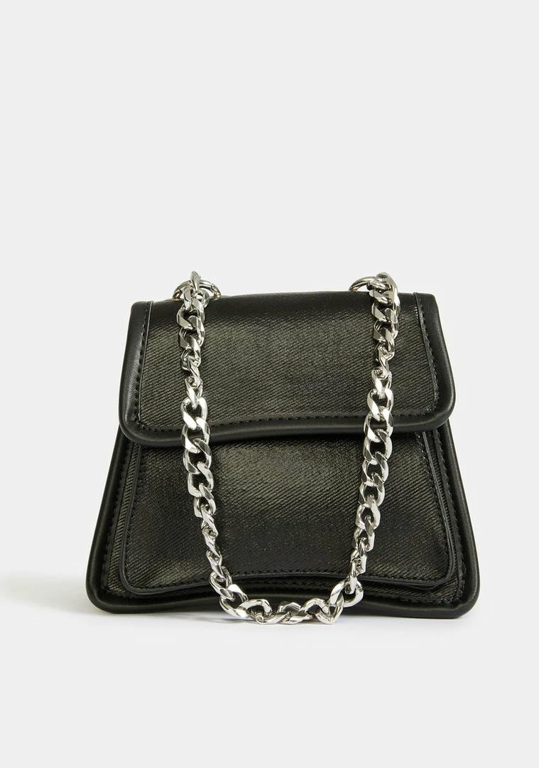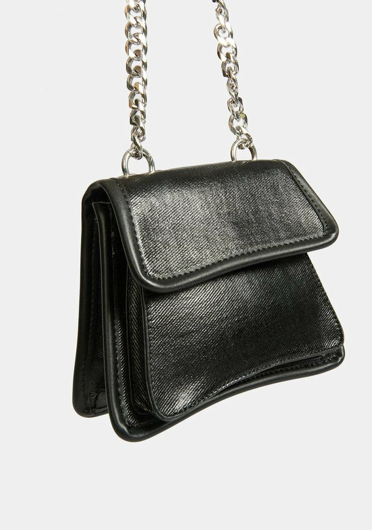 cuz bad babes like you are hard to come by! This angled mini purse has a denim construction with a matte vegan leather coating and a chunky chain shoulder strap.