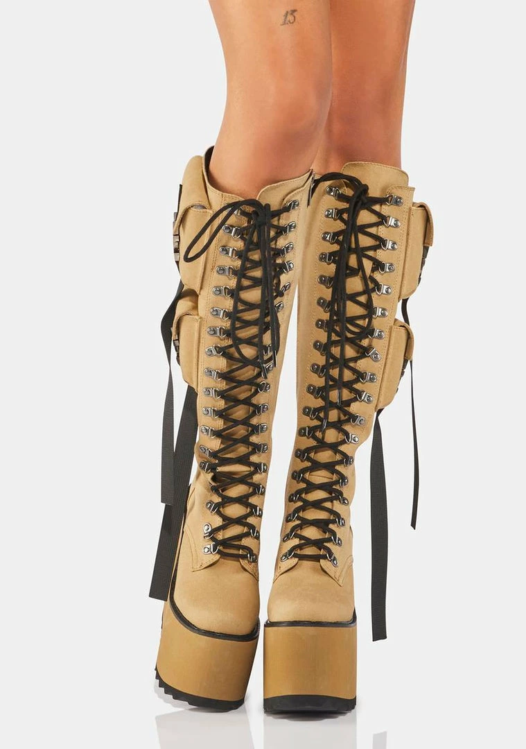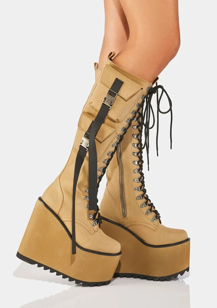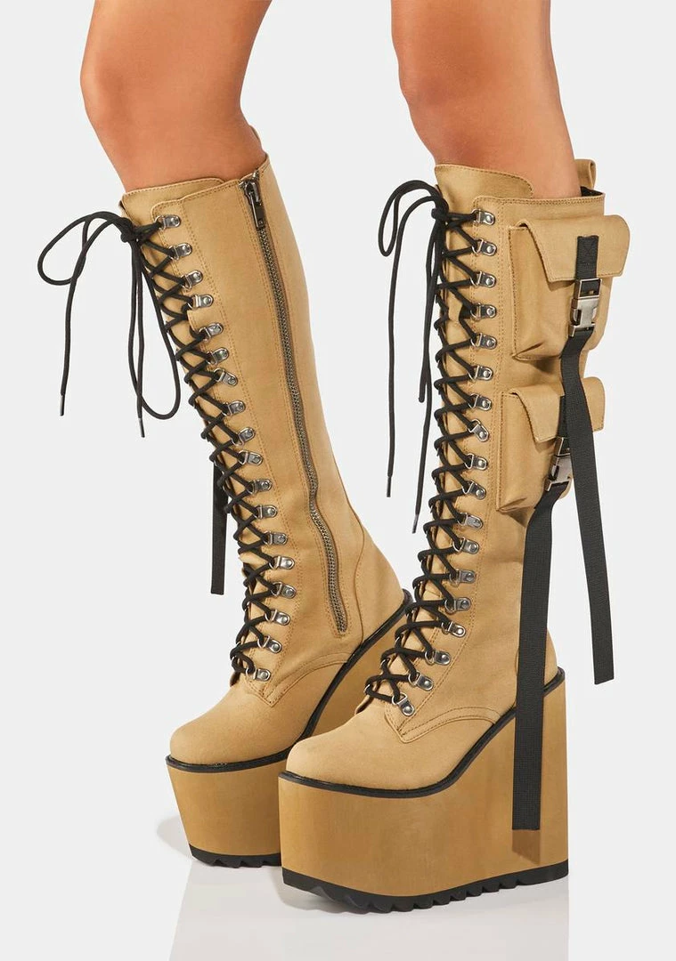 cuz you always come first. You’re on a journey to glow up with these knee high boots that have lace up fronts, side zipper closures, utility pockets with buckle straps, and platform wedge heels.