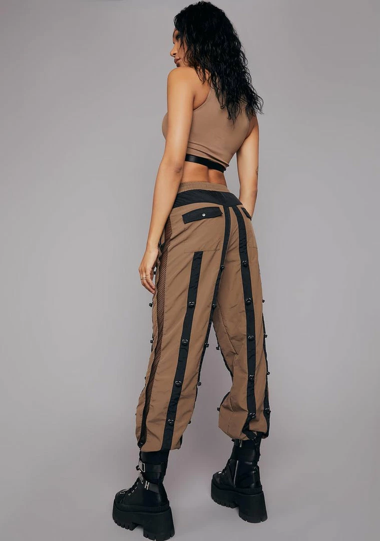 cuz you’re ready to take it to the next level. These high-rise pants have a drawstring waist, zipper and snap button pockets, fishnet paneling down the sides, and a black striped design with drawstring cords all over.