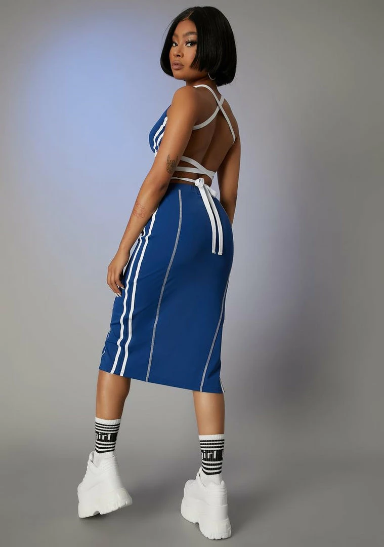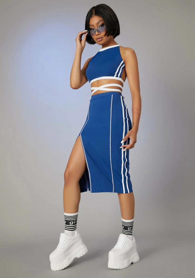 cuz thereâs no runninâ up on you, babe! This sporty contrast stitch set includes a halter crop top with contrast piping down the sides & adjustable wrap straps and a midi pencil skirt with a high waist bodycon fit & a side slit.