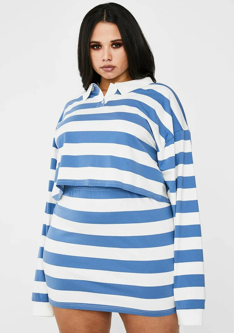 got ’em turning heads in your direction, babe. The whole class is crushin’ on ya in this cute AF polo crop top N’ mini skirt set that has a rugby striped pattern all ova, lil back pocket N’ button-up closures.