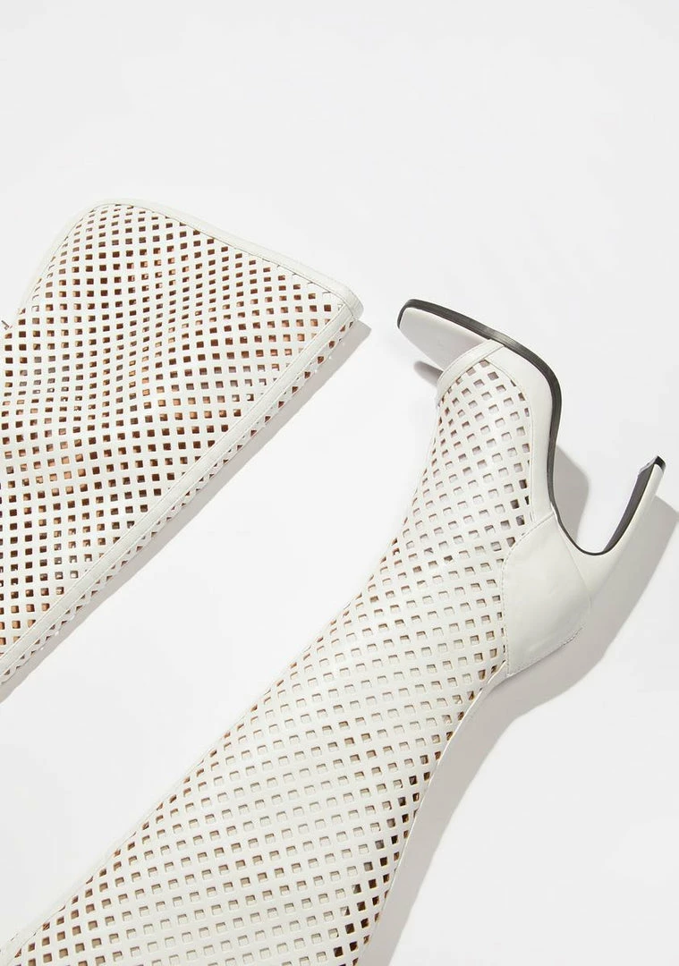 because theyâre begging for it. These knee high boots have a vegan leather construction with a perforated grid overlay, peep-toe construction and a slim rectangular heel.